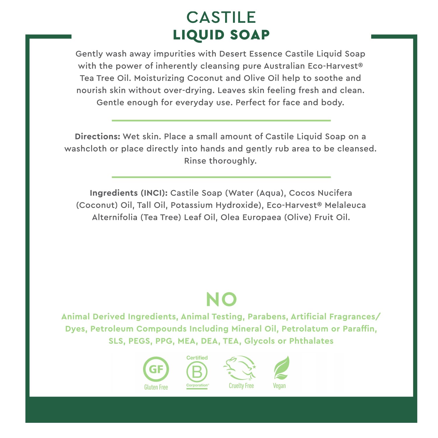 About this item PREMIUM OLIVE OIL MOISTURIZATION: Experience the luxurious hydration of Desert Essence Liquid Castile Soap, enriched with premium-quality olive oil—the nutrient-rich heart of traditional Castile soap recipes. This deeply moisturizing ingredient revitalizes skin, leaving it naturally soft, smooth, and supple. ECO-HARVEST TEA TREE & COCONUT OIL: Infused with potent Eco-Harvest Tea Tree Oil and nourishing coconut oil, our versatile liquid soap effectively cleanses and refreshes hands, face, and body. The gentle formula helps soothe skin irritation while providing balanced moisture for healthier-looking skin. PURE, VERSATILE CLEANSING SOLUTION: Desert Essence Castile Soap is thoughtfully crafted as an all-purpose cleanser suitable for your hands, face, and body. Free from harmful additives like parabens, artificial dyes, fragrances, silicones, mineral oil, petrolatum, and phosphates, making it safe and gentle for daily use. NO: Animal Derived Ingredients, Animal Testing, Parabens, Phthalates, Artificial Dyes or Fragrances, Silicones, EDTA, Propylene glycol, Mineral Oil, Petrolatum, Paraffin or Phosphates Wet skin. Place a small amount of Castile Liquid Soap on a washcloth or place directly into hands and gently rub area to be cleansed. Rinse thoroughly. › See more product details,PREMIUM OLIVE OIL MOISTURIZATION: Experience the luxurious hydration of Desert Essence Liquid Castile Soap, enriched with premium-quality olive oil—the nutrient-rich heart of traditional Castile soap recipes. This deeply moisturizing ingredient revitalizes skin, leaving it naturally soft, smooth, and supple,ECO-HARVEST TEA TREE & COCONUT OIL: Infused with potent Eco-Harvest Tea Tree Oil and nourishing coconut oil, our versatile liquid soap effectively cleanses and refreshes hands, face, and body. The gentle formula helps soothe skin irritation while providing balanced moisture for healthier-looking skin,PURE, VERSATILE CLEANSING SOLUTION: Desert Essence Castile Soap is thoughtfully crafted as an all-purpose cleanser suitable for your hands, face, and body. Free from harmful additives like parabens, artificial dyes, fragrances, silicones, mineral oil, petrolatum, and phosphates, making it safe and gentle for daily use,NO: Animal Derived Ingredients, Animal Testing, Parabens, Phthalates, Artificial Dyes or Fragrances, Silicones, EDTA, Propylene glycol, Mineral Oil, Petrolatum, Paraffin or Phosphates,Wet skin. Place a small amount of Castile Liquid Soap on a washcloth or place directly into hands and gently rub area to be cleansed. Rinse thoroughly