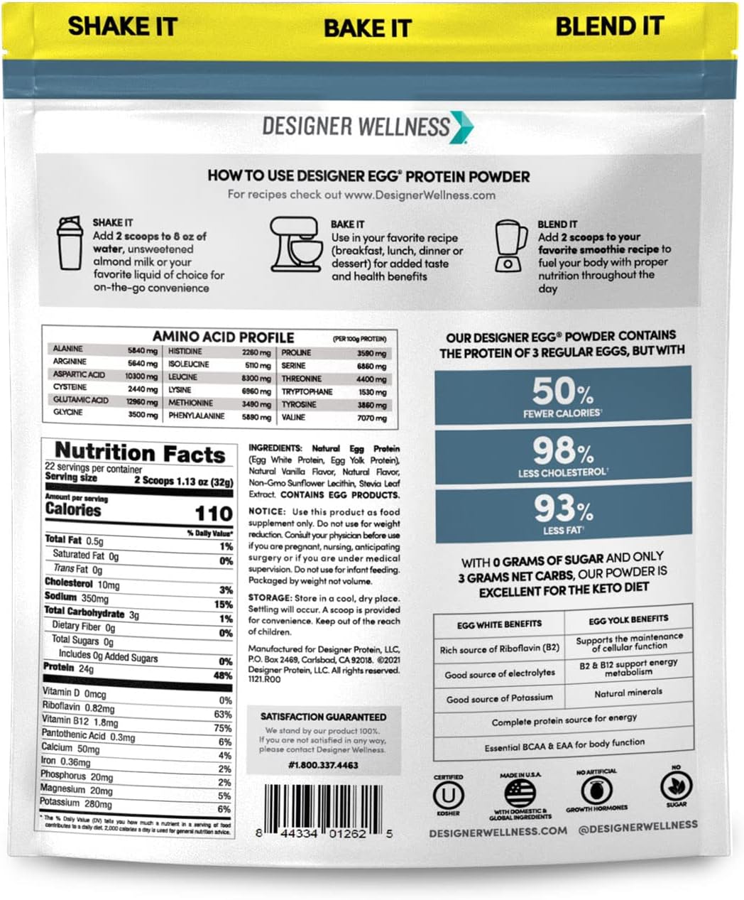 About this item LOADED WITH QUALITY PROTEIN: 24 grams of delicious egg protein per serving THE BETTER EGG: 1 serving packs the equivalent protein of 3 regular eggs, but with 50% fewer calories, 93% less fat and 98% less cholesterol CLEAN NUTRITION: Only 110 calories, zero sugar, and 6 ingredients; packed with BCAAs, Essential Amino Acids, Riboflavin, B12 and Potassium QUALITY INGREDIENTS: Gluten-free, dairy-free, lactose-free and Kosher; no artificial flavors, no erythritol, no artificial sweeteners, no artificial colors, no preservatives, no growth hormones, and no antibiotics Designer Wellness is based in Carlsbad California; our products have been manufactured in the USA in cGMP compliant manufacturing facilities since 1993 › See more product details,LOADED WITH QUALITY PROTEIN: 24 grams of delicious egg protein per serving,THE BETTER EGG: 1 serving packs the equivalent protein of 3 regular eggs, but with 50% fewer calories, 93% less fat and 98% less cholesterol,CLEAN NUTRITION: Only 110 calories, zero sugar, and 6 ingredients; packed with BCAAs, Essential Amino Acids, Riboflavin, B12 and Potassium,QUALITY INGREDIENTS: Gluten-free, dairy-free, lactose-free and Kosher; no artificial flavors, no erythritol, no artificial sweeteners, no artificial colors, no preservatives, no growth hormones, and no antibiotics,Designer Wellness is based in Carlsbad California; our products have been manufactured in the USA in cGMP compliant manufacturing facilities since 1993