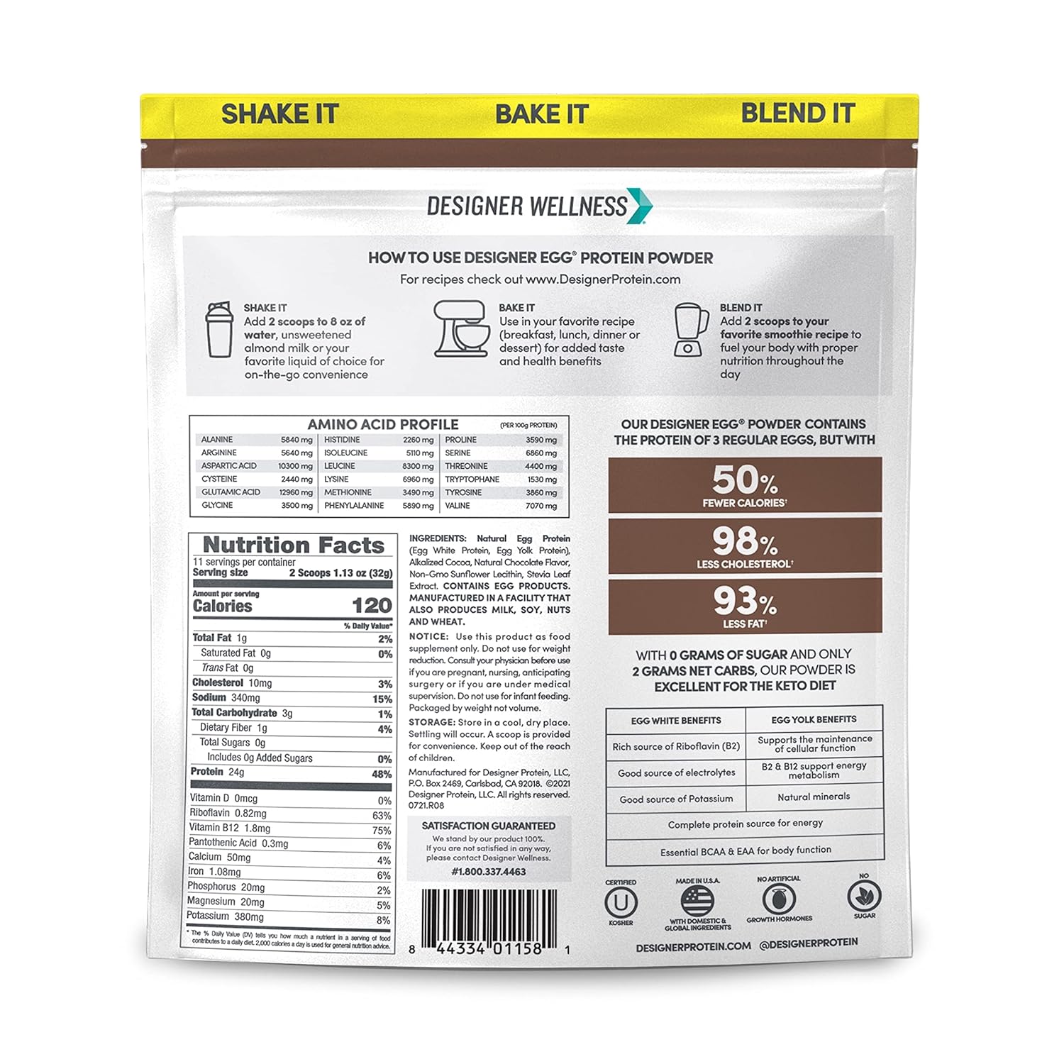 About this item Bundle comes with one 12.4 ounce Chocolate Designer Egg and one 12.4 ounce Vanilla Designer Egg Protein Powder. LOADED WITH QUALITY PROTEIN: 24 grams of delicious egg protein per serving THE BETTER EGG: 1 serving packs the equivalent protein of 3 regular eggs, but with 50% fewer calories, 93% less fat and 98% less cholesterol CLEAN NUTRITION: Only 110 calories, zero sugar, and 6 ingredients; packed with BCAAs, Essential Amino Acids, Riboflavin, B12 and Potassium QUALITY INGREDIENTS: Gluten-free, dairy-free, lactose-free and Kosher; no artificial flavors, no artificial sweeteners, no artificial colors, no preservatives, no growth hormones, and no antibiotics › See more product details,Bundle comes with one 12.4 ounce Chocolate Designer Egg and one 12.4 ounce Vanilla Designer Egg Protein Powder,LOADED WITH QUALITY PROTEIN: 24 grams of delicious egg protein per serving,THE BETTER EGG: 1 serving packs the equivalent protein of 3 regular eggs, but with 50% fewer calories, 93% less fat and 98% less cholesterol,CLEAN NUTRITION: Only 110 calories, zero sugar, and 6 ingredients; packed with BCAAs, Essential Amino Acids, Riboflavin, B12 and Potassium,QUALITY INGREDIENTS: Gluten-free, dairy-free, lactose-free and Kosher; no artificial flavors, no artificial sweeteners, no artificial colors, no preservatives, no growth hormones, and no antibiotics