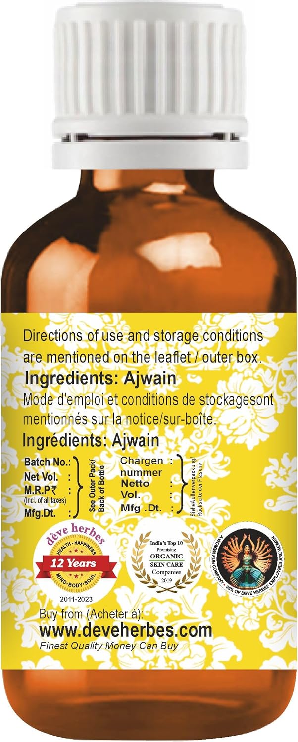 Quantity -30ml (1.01 oz) Container Type - High Quality Amber Glass Bottle. Botanical Name - Trachyspermum ammi, 100% Pure, Natural, Undiluted, Premium, Therapeutic Grade Essential Oil Alcohol free, Solvent Free, Vegan, Cruelty Free, Not Tested on Animals. Method of Extraction - Steam Distillation