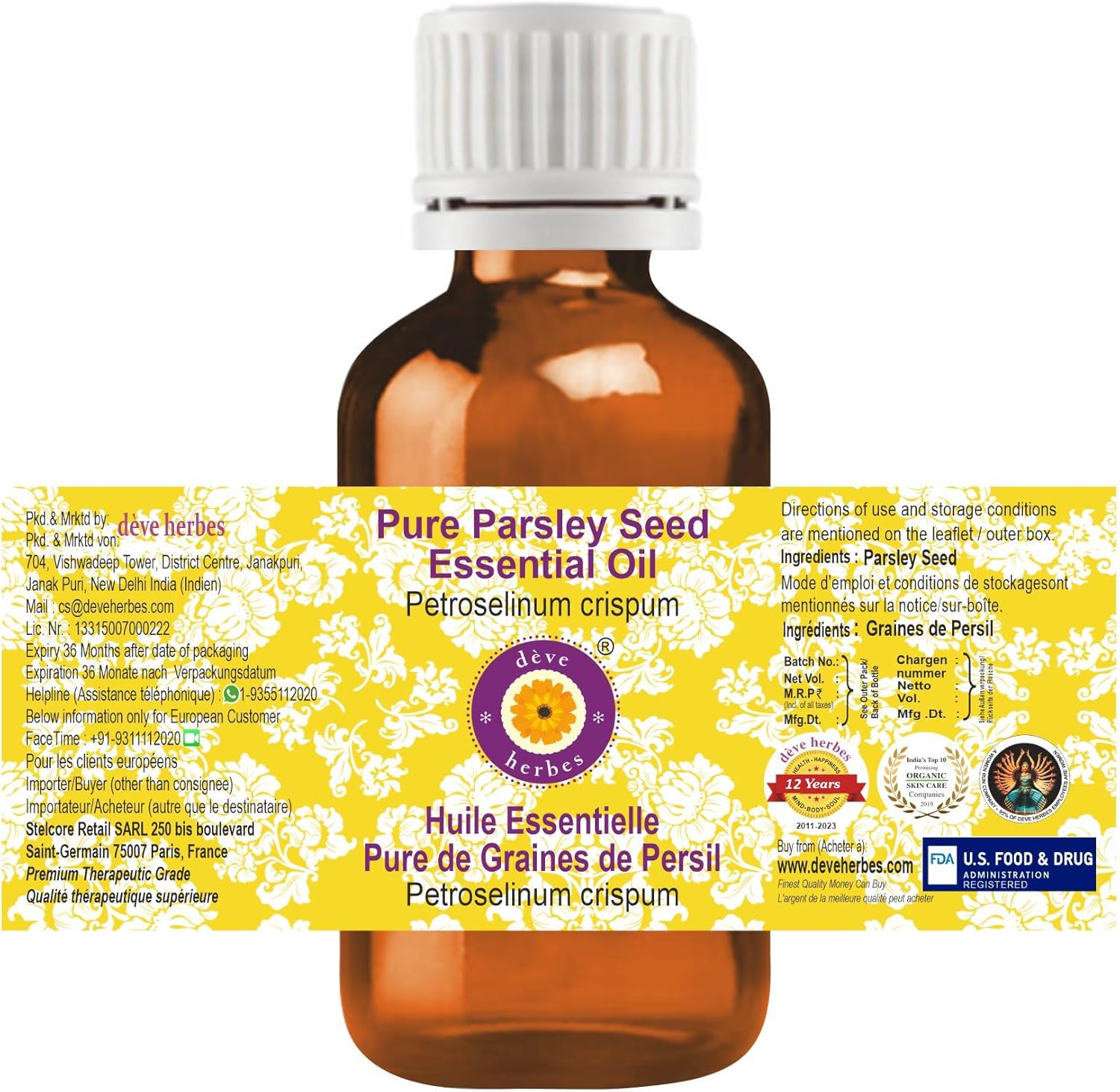 About this item Quantity - 30ml (1 oz), Container Type - High Quality Amber Glass Bottle designed to preserve potency. Method of Extraction - Steam Distillation, Botanical Name -Petroselinum crispum, Daily skin care Regimen, Lightweight, Non-greasy, Non-sticky, For all seasons. Features - Pure, Natural, Undiluted, Single ingredient, Therapeutic Grade, Alcohol-Free, Solvent Free, Cruelty-Free, Paraben Free, No Additives, No preservatives, Non-deodorized, Vegan, Suitable for All Skin Type For Skin & Hair Application - Do not apply directly to the skin, always dilute with a carrier oil. 1% for daily facial care, 5-6 drops in 30ml carrier oil. 2% for daily body care, 10-12 drops in 30ml carrier oil. 3-5% for acute care, 15-30 drops in 30ml carrier oil. 1ml is made up of about 16 drops. Additional Usage - Essential oils are widely used in cosmetics, perfumes, cleaning products, home fragrances and aromatherapy. SATISFACTION & PURITY - We, the manufacturer, Deve Herbes, offer that our oils are pure & natural. If you are unsatisfied for any reason, we will replace your product or reimburse your amount. We believe our oils will impart lasting therapeutic benefits to you. We believe in our products & have been offering 'No Questions Asked reimbursement' for the last 13 years. › See more product details,Quantity - 30ml (1 oz), Container Type - High Quality Amber Glass Bottle designed to preserve potency. Method of Extraction - Steam Distillation, Botanical Name -Petroselinum crispum, Daily skin care Regimen, Lightweight, Non-greasy, Non-sticky, For all seasons,Features - Pure, Natural, Undiluted, Single ingredient, Therapeutic Grade, Alcohol-Free, Solvent Free, Cruelty-Free, Paraben Free, No Additives, No preservatives, Non-deodorized, Vegan, Suitable for All Skin Type,For Skin & Hair Application - Do not apply directly to the skin, always dilute with a carrier oil. 1% for daily facial care, 5-6 drops in 30ml carrier oil. 2% for daily body care, 10-12 drops in 30ml carrier oil. 3-5% for acute care, 15-30 drops in 30ml carrier oil. 1ml is made up of about 16 drops,Additional Usage - Essential oils are widely used in cosmetics, perfumes, cleaning products, home fragrances and aromatherapy,SATISFACTION & PURITY - We, the manufacturer, Deve Herbes, offer that our oils are pure & natural. If you are unsatisfied for any reason, we will replace your product or reimburse your amount. We believe our oils will impart lasting therapeutic benefits to you. We believe in our products & have been offering 'No Questions Asked reimbursement' for the last 13 years