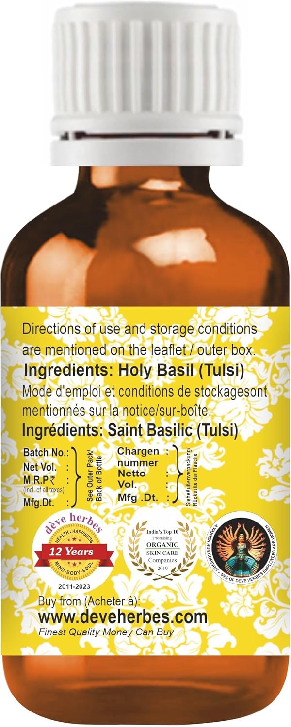 Quantity - 10ml (0.33 oz), Container Type - High Quality Amber Glass Bottle designed to preserve potency. Method of Extraction - Steam Distillation, Botanical Name -Ocimum sanctum, Daily skin care Regimen, Lightweight, Non-greasy, Non-sticky, For all seasons
