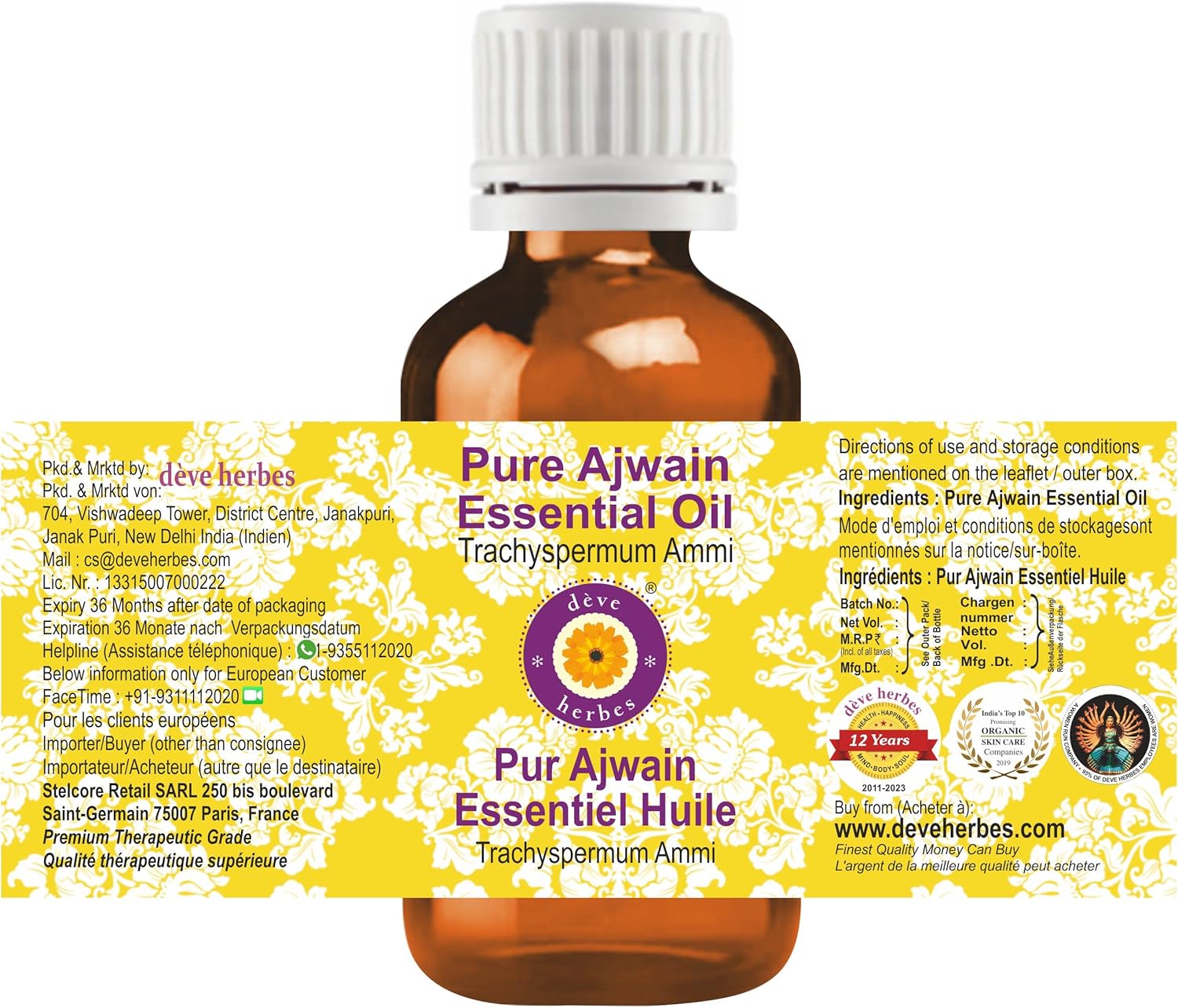 Quantity -30ml (1.01 oz) Container Type - High Quality Amber Glass Bottle. Botanical Name - Trachyspermum ammi, 100% Pure, Natural, Undiluted, Premium, Therapeutic Grade Essential Oil Alcohol free, Solvent Free, Vegan, Cruelty Free, Not Tested on Animals. Method of Extraction - Steam Distillation