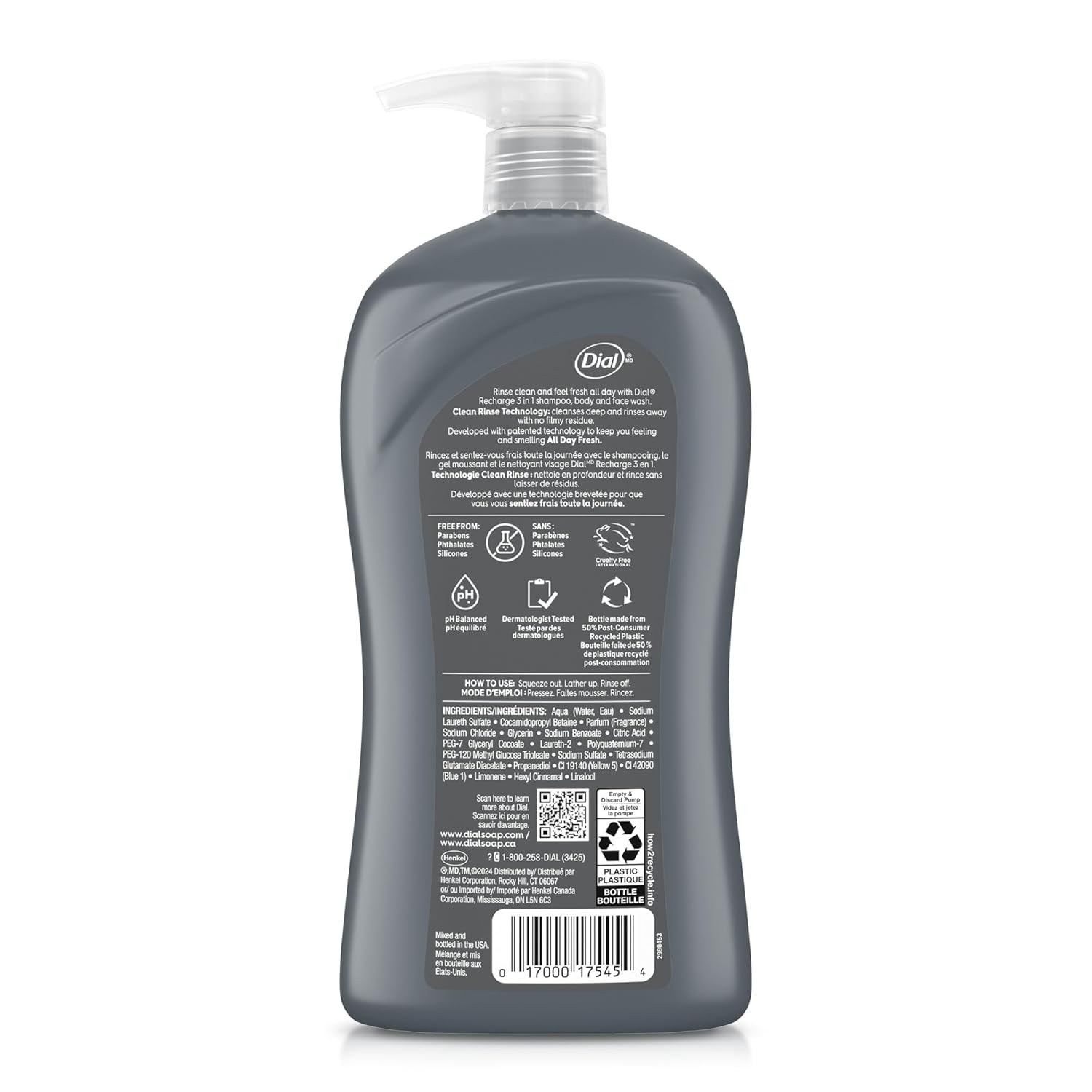 About this item BODY, HAIR & FACE WASH (3-in-1): Experience the convenience of shampoo, body wash, and face cleanser in one handy bottle, engineered for an all-in-one solution. 32 Fl Oz bottle. ALL DAY FRESH: With a rich lather that rinses clean and leaves skin feeling fresh. All day fresh & healthy skin. Dial Men Recharge features a cedar leaf scent. CLEAN RINSE TECHNOLOGY: Formulated with Clean Rinse Technology, cleanses deep and rinses away with no filmy residue. The fresh scent stays with you even after you rinse off. Dermatologist tested and approved as cruelty free under the Leaping Bunny Program. FREE FROM: Made without parabens, phthalates, and silicones. Features a 100% recycled plastic bottle (excludes cap). As one of the founding American personal cleansing brands, Dial introduced the first ever antibacterial liquid hand soap in 1948. Today, the Dial brand continues to innovate with formulations across body wash, bar and hand soap to help you, and your family, dial up your clean. › See more product details,BODY, HAIR & FACE WASH (3-in-1): Experience the convenience of shampoo, body wash, and face cleanser in one handy bottle, engineered for an all-in-one solution. 32 Fl Oz bottle,ALL DAY FRESH: With a rich lather that rinses clean and leaves skin feeling fresh. All day fresh & healthy skin. Dial Men Recharge features a cedar leaf scent,CLEAN RINSE TECHNOLOGY: Formulated with Clean Rinse Technology, cleanses deep and rinses away with no filmy residue. The fresh scent stays with you even after you rinse off. Dermatologist tested and approved as cruelty free under the Leaping Bunny Program,FREE FROM: Made without parabens, phthalates, and silicones. Features a 100% recycled plastic bottle (excludes cap),As one of the founding American personal cleansing brands, Dial introduced the first ever antibacterial liquid hand soap in 1948. Today, the Dial brand continues to innovate with formulations across body wash, bar and hand soap to help you, and your family, dial up your clean