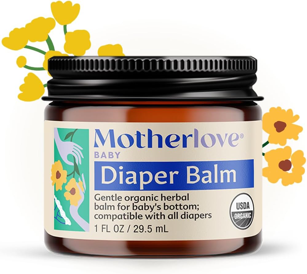 About this item SOOTHE BABY'S BUM: Organic Diaper Balm is clinically tested for irritation. This natural diaper rash cream helps to alleviate diaper irritation and restore yeast balance with antifungal and antibacterial herbs. CLOTH DIAPER SAFE: Diaper Balm is zinc oxide- and petroleum-free and is compatible with all diapers. Cloth, disposable, compostable—you name it! CLEAN INGREDIENTS: Extra virgin olive oil, beeswax, Oregon grape root, myrrh gum, yarrow herb, calendula flower. All natural and organic. Nothing else. CLEAN INGREDIENTS: Extra virgin olive oil, beeswax, Oregon grape root, myrrh gum, yarrow herb, calendula flower. All natural and organic. Nothing else. PREMIUM QUALITY: Diaper Balm is USDA Certified Organic (which means non-GMO, too!), Certified Cruelty Free by Leaping Bunny, and made in the USA with imported ingredients. Manufactured in a solar-powered, zero-waste facility. Motherlove is a certified Women-Owned B-Corp that focuses on environmental and social sustainability. › See more product details,SOOTHE BABY'S BUM: Organic Diaper Balm is clinically tested for irritation. This natural diaper rash cream helps to alleviate diaper irritation and restore yeast balance with antifungal and antibacterial herbs,CLOTH DIAPER SAFE: Diaper Balm is zinc oxide- and petroleum-free and is compatible with all diapers. Cloth, disposable, compostable—you name it!,CLEAN INGREDIENTS: Extra virgin olive oil, beeswax, Oregon grape root, myrrh gum, yarrow herb, calendula flower. All natural and organic. Nothing else,CLEAN INGREDIENTS: Extra virgin olive oil, beeswax, Oregon grape root, myrrh gum, yarrow herb, calendula flower. All natural and organic. Nothing else,PREMIUM QUALITY: Diaper Balm is USDA Certified Organic (which means non-GMO, too!), Certified Cruelty Free by Leaping Bunny, and made in the USA with imported ingredients. Manufactured in a solar-powered, zero-waste facility. Motherlove is a certified Women-Owned B-Corp that focuses on environmental and social sustainability