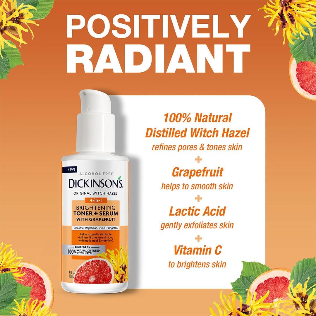 About this item CLEAR, BALANCED SKIN: Dickinson's Original Witch Hazel Clearing Toner + Serum with Eucalyptus features Salicylic Acid, Niacinamide, and Eucalyptus which work together to gently resurface, detoxify, and refine skin for a clearer complexion. TONER + SERUM IN ONE: Combine the cooling, purifying benefits of Eucalyptus with 100% natural Witch Hazel to tone, soothe, and refresh skin. THE ONE & ONLY GENUINE WITCH HAZEL SINCE 1866: Our witch hazel is sustainably harvested and 100% natural distilled with an exclusive plant-to-bottle process, ensuring the highest grade of purity and effectiveness for your skin. CLEAN, VEGAN & CRUELTY-FREE: Free from dyes, sulfates, parabens, phthalates, and gluten. Dermatologist-tested and never tested on animals. Sustainably harvested to protect our plants and planet. EFFECTIVE BOTANICAL FORMULA: Alcohol-free and packed with skin-loving botanicals to nourish and refresh without irritation. › See more product details,CLEAR, BALANCED SKIN: Dickinson's Original Witch Hazel Clearing Toner + Serum with Eucalyptus features Salicylic Acid, Niacinamide, and Eucalyptus which work together to gently resurface, detoxify, and refine skin for a clearer complexion,TONER + SERUM IN ONE: Combine the cooling, purifying benefits of Eucalyptus with 100% natural Witch Hazel to tone, soothe, and refresh skin,THE ONE & ONLY GENUINE WITCH HAZEL SINCE 1866: Our witch hazel is sustainably harvested and 100% natural distilled with an exclusive plant-to-bottle process, ensuring the highest grade of purity and effectiveness for your skin,CLEAN, VEGAN & CRUELTY-FREE: Free from dyes, sulfates, parabens, phthalates, and gluten. Dermatologist-tested and never tested on animals. Sustainably harvested to protect our plants and planet,EFFECTIVE BOTANICAL FORMULA: Alcohol-free and packed with skin-loving botanicals to nourish and refresh without irritation