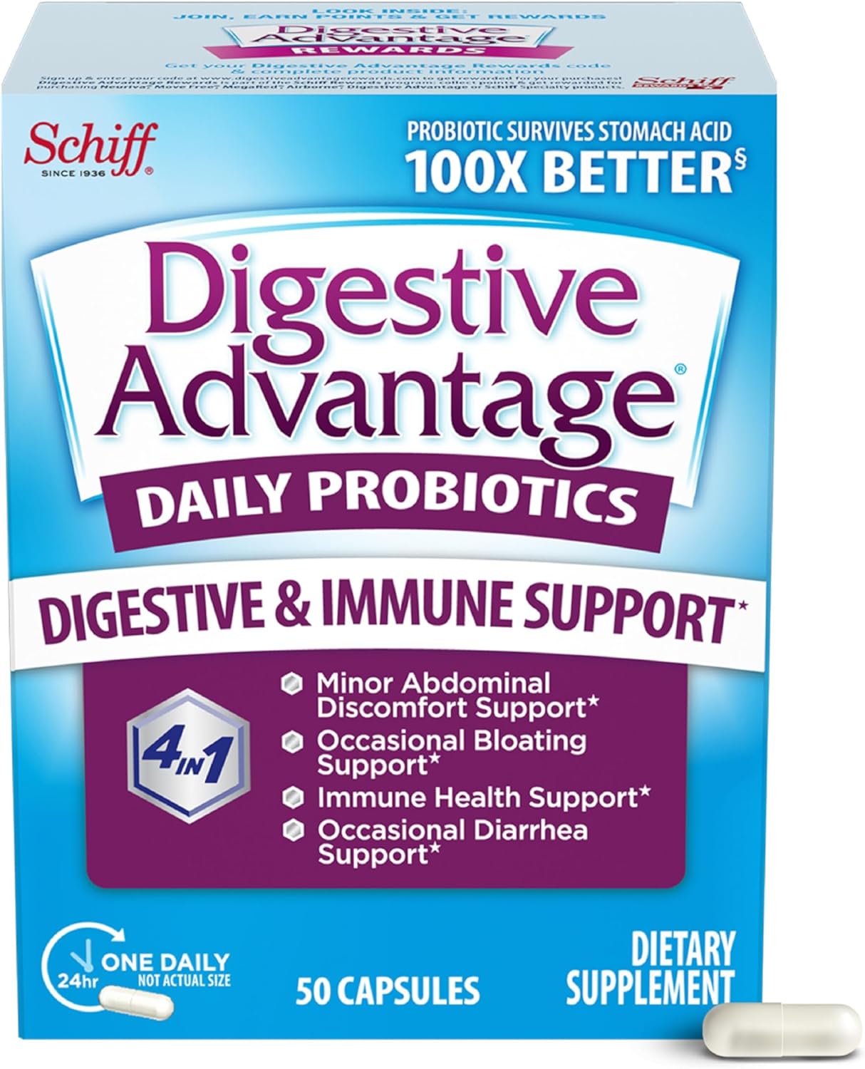 About this item PROBIOTIC: Digestive Advantage Daily Probiotics for women & men are crafted to help support your digestive health and immune health.* FOUR IN ONE: Our probiotic capsules help immune support, occasional bloating, occasional diarrhea, and minor abdominal discomfort.* ONE-HUNDRED TIMES BETTER: 2 Billion CFUs of patented BC-30 probiotics survives stomach acid 100X BETTER vs. yogurt BETTER THAN 50 BILLION: Our BC-30 Probiotics survives better than products offering 50 Billion live cultures. IMMUNITY: 70% of your immune system is in your digestive tract. The good bacteria in Digestive Advantage Daily Probiotics helps support the immune cells in your gut. EQUALS 8 YOGURTS: Our 1 daily capsule survives as well 8 yogurts . Our mens and womens probiotic support digestive balance. PATENTED PROBIOTIC: It is protected with a natural protein shell to deliver more beneficial bacteria to your gut alive, to support your gut health.* Digestive Advantage Daily Probiotic capsules are Gluten Free, Non-GMO, No Dairy, Vegetarian, and are guaranteed for Purity, Freshness, Potency. THE INSIDE ADVANTAGE: Digestive Advantage prebiotic and probiotic fiber gummies, probiotic pills, probiotic gummies, and kids gummies are designed to target the source and support gut health for women and men.* *These statements have not been evaluated by the Food and Drug Administration. This product is not intended to diagnose, treat, cure or prevent any disease. Based on median survivability of Digestive Advantage Probiotic BC30 vs. yogurts in a simulated gastric environment,PROBIOTIC: Digestive Advantage Daily Probiotics for women & men are crafted to help support your digestive health and immune health,FOUR IN ONE: Our probiotic capsules help immune support, occasional bloating, occasional diarrhea, and minor abdominal discomfort,ONE-HUNDRED TIMES BETTER: 2 Billion CFUs of patented BC-30 probiotics survives stomach acid 100X BETTER vs. yogurt,BETTER THAN 50 BILLION: Our BC-30 Probiotics survives better than products offering 50 Billion live cultures,IMMUNITY: 70% of your immune system is in your digestive tract. The good bacteria in Digestive Advantage Daily Probiotics helps support the immune cells in your gut,EQUALS 8 YOGURTS: Our 1 daily capsule survives as well 8 yogurts . Our mens and womens probiotic support digestive balance,PATENTED PROBIOTIC: It is protected with a natural protein shell to deliver more beneficial bacteria to your gut alive, to support your gut health,Digestive Advantage Daily Probiotic capsules are Gluten Free, Non-GMO, No Dairy, Vegetarian, and are guaranteed for Purity, Freshness, Potency,THE INSIDE ADVANTAGE: Digestive Advantage prebiotic and probiotic fiber gummies, probiotic pills, probiotic gummies, and kids gummies are designed to target the source and support gut health for women and men,*These statements have not been evaluated by the Food and Drug Administration. This product is not intended to diagnose, treat, cure or prevent any disease. Based on median survivability of Digestive Advantage Probiotic BC30 vs. yogurts in a simulated gastric environment