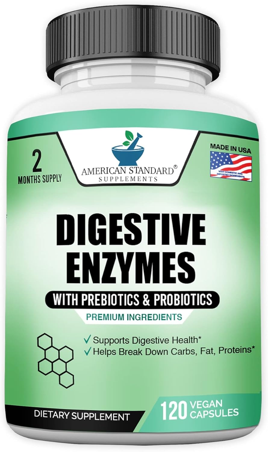 American Standard Supplements Digestive Enzymes ofrece la potencia más alta del mercado. Nuestra fórmula personalizada contiene Prebióticos + 1 Billón de Probióticos + Enzima Digestiva. Estas 3 combinaciones son bien conocidas por mejorar la salud de su digestión. Este suplemento digestivo es para la salud de mujeres y hombres. Tomar nuestras enzimas digestivas formuladas con probióticos y prebióticos lo mantendrá saludable todo el tiempo