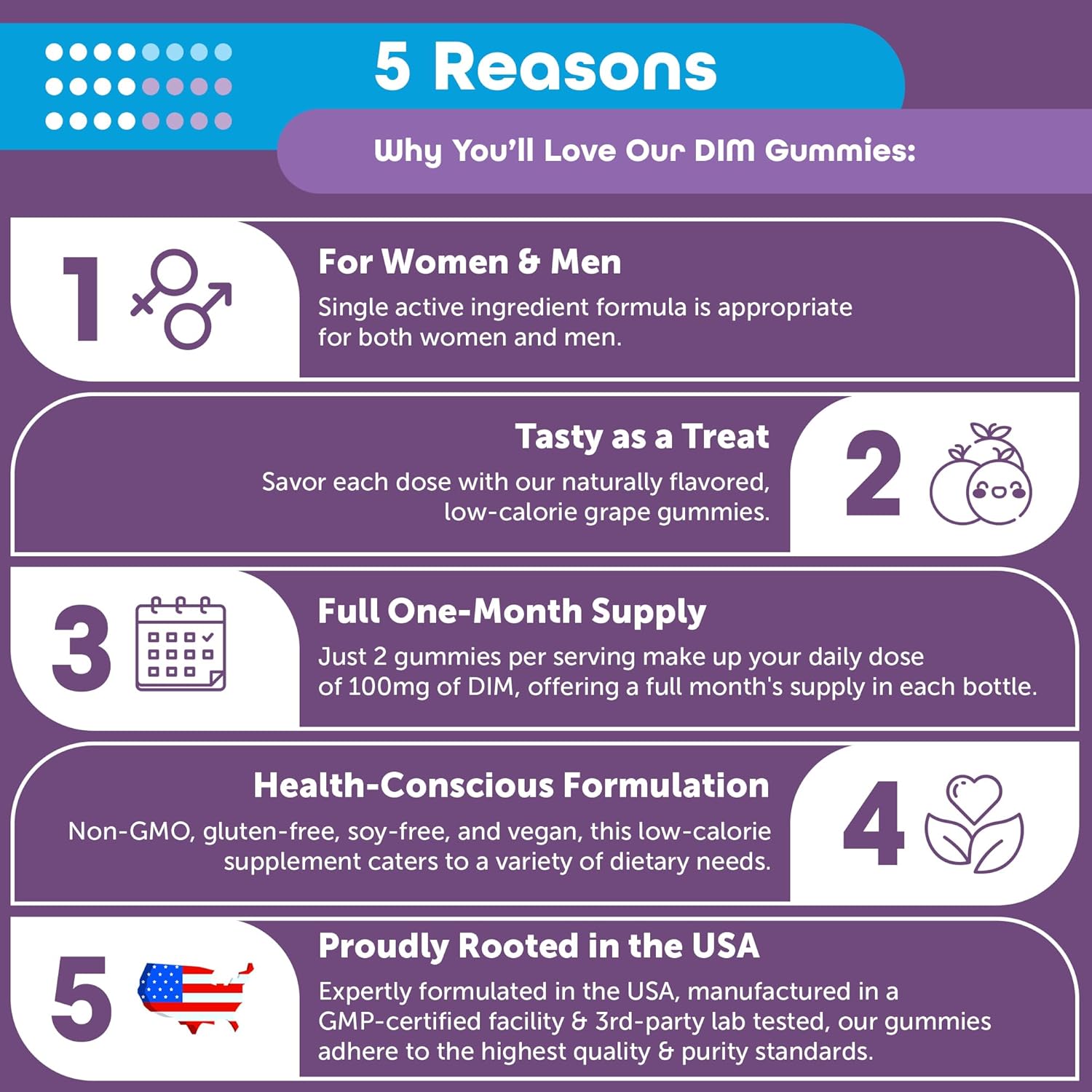 About this item Natural Hormone Balance – Diindolylmethane (DIM) is a natural compound found in vegetables from the Brassica family (e.g. broccoli & kale). Support this process in your body with our delicious natural grape flavor gummies Nutritionally Balanced, Perfectly Formulated – Crafted with care, our DIM hormone support gummies meet a variety of dietary needs & preferences. They're vegan, non-GMO, soy-free, gluten-free & low in calories, giving you a health-conscious supplement Trust in Every Gummy – Your health is our utmost priority. That’s why our DIM hormonal balance gummies are carefully formulated in the USA, produced in a GMP-certified facility & rigorously 3rd-party lab tested for purity & potency See more product details,Natural Hormone Balance – Diindolylmethane (DIM) is a natural compound found in vegetables from the Brassica family (e.g. broccoli & kale). Support this process in your body with our delicious natural grape flavor gummies,Nutritionally Balanced, Perfectly Formulated – Crafted with care, our DIM hormone support gummies meet a variety of dietary needs & preferences. They're vegan, non-GMO, soy-free, gluten-free & low in calories, giving you a health-conscious supplement,Trust in Every Gummy – Your health is our utmost priority. That’s why our DIM hormonal balance gummies are carefully formulated in the USA, produced in a GMP-certified facility & rigorously 3rd-party lab tested for purity & potency