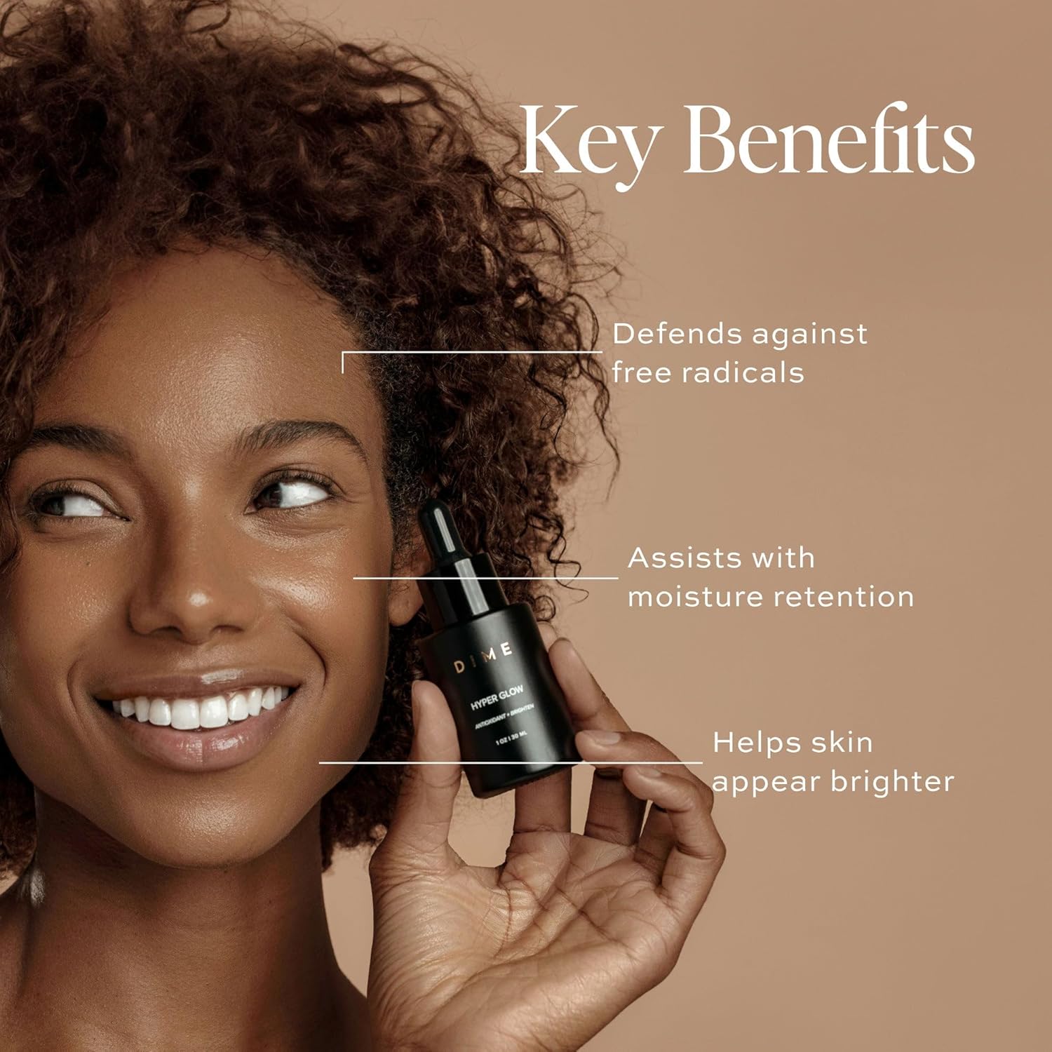 About this item VITAMIN C SERUM: Get your glow on with our Hyper Glow Serum! This perfect morning serum gives your skin the dewy glow it needs to take on the day ahead. Leave your skin feeling brighter, tighter, and more supple with Hyper Glow! POWERFUL, BRIGHTENING INGREDIENTS: Armed with 15% vitamin C, this serum is also supercharged with ferulic acid, hyaluronic acid, sweet orange extract, magnolia bark extract, aloe, resveratrol, and grape seed extract, which helps increase its free radical-fighting ability. LEAVES SKIN GLOWING: The hydrating, nourishing, and brightening ingredients in this serum leave skin luminous and perfectly prepped for your day. Apply it daily for a natural glow and to boost your skin's natural defense against damage. SUGGESTED USE: After cleansing face with a DIME cleanser, apply 3-4 drops every morning and night (or as needed) to the face and neck area. Massage into skin. Make sure to follow with a DIME moisturizer. For best results, apply daily. THE DIME DIFFERENCE: At DIME Beauty, the difference is in the details. We stand apart with sustainable packaging, clean ingredients, vegan and cruelty-free formulas, and a focus on your well-being. In addition, each ingredient we use has a safe Environmental-Working-Group rating so you can use our products daily with confidence. › See more product details,VITAMIN C SERUM: Get your glow on with our Hyper Glow Serum! This perfect morning serum gives your skin the dewy glow it needs to take on the day ahead. Leave your skin feeling brighter, tighter, and more supple with Hyper Glow!,POWERFUL, BRIGHTENING INGREDIENTS: Armed with 15% vitamin C, this serum is also supercharged with ferulic acid, hyaluronic acid, sweet orange extract, magnolia bark extract, aloe, resveratrol, and grape seed extract, which helps increase its free radical-fighting ability,LEAVES SKIN GLOWING: The hydrating, nourishing, and brightening ingredients in this serum leave skin luminous and perfectly prepped for your day. Apply it daily for a natural glow and to boost your skin's natural defense against damage,SUGGESTED USE: After cleansing face with a DIME cleanser, apply 3-4 drops every morning and night (or as needed) to the face and neck area. Massage into skin. Make sure to follow with a DIME moisturizer. For best results, apply daily,THE DIME DIFFERENCE: At DIME Beauty, the difference is in the details. We stand apart with sustainable packaging, clean ingredients, vegan and cruelty-free formulas, and a focus on your well-being. In addition, each ingredient we use has a safe Environmental-Working-Group rating so you can use our products daily with confidence