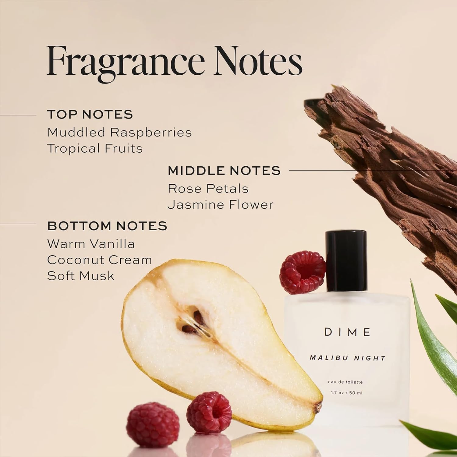 About this item FRUITY GOURMAND SCENT: Malibu Night captures the serenity of a pleasant evening beach stroll. With light, refreshing, sweet tones, this luxurious fragrance is sure to win your sensory heart and take you to fragrance paradise. TROPICAL TOP NOTES: Fruity top notes of muddled raspberries and tropical fruits tantalize the senses as you first spritz it on. FLORAL MIDDLE NOTES: PLAYFUL: Rose petals and jasmine flower comingle in the middle notes of the multi-layered fragrance for a classic floral essence. CREAMY BASE NOTES: Finally, this fragrance rounds off with bottom notes of rich warm vanilla, sweet coconut cream, and soft musk for a deliciously creamy finish. DIME CLEAN PROMISE: At DIME Beauty, the difference is in the details. The organic sugar cane alcohol used in our scents is considered one of the cleanest and safest available, and each fragrance is made in the USA. We stand apart with sustainable packaging, clean ingredients, vegan and cruelty-free formulas, and a focus on your well-being. › See more product details,FRUITY GOURMAND SCENT: Malibu Night captures the serenity of a pleasant evening beach stroll. With light, refreshing, sweet tones, this luxurious fragrance is sure to win your sensory heart and take you to fragrance paradise,TROPICAL TOP NOTES: Fruity top notes of muddled raspberries and tropical fruits tantalize the senses as you first spritz it on,FLORAL MIDDLE NOTES: PLAYFUL: Rose petals and jasmine flower comingle in the middle notes of the multi-layered fragrance for a classic floral essence,CREAMY BASE NOTES: Finally, this fragrance rounds off with bottom notes of rich warm vanilla, sweet coconut cream, and soft musk for a deliciously creamy finish,DIME CLEAN PROMISE: At DIME Beauty, the difference is in the details. The organic sugar cane alcohol used in our scents is considered one of the cleanest and safest available, and each fragrance is made in the USA. We stand apart with sustainable packaging, clean ingredients, vegan and cruelty-free formulas, and a focus on your well-being