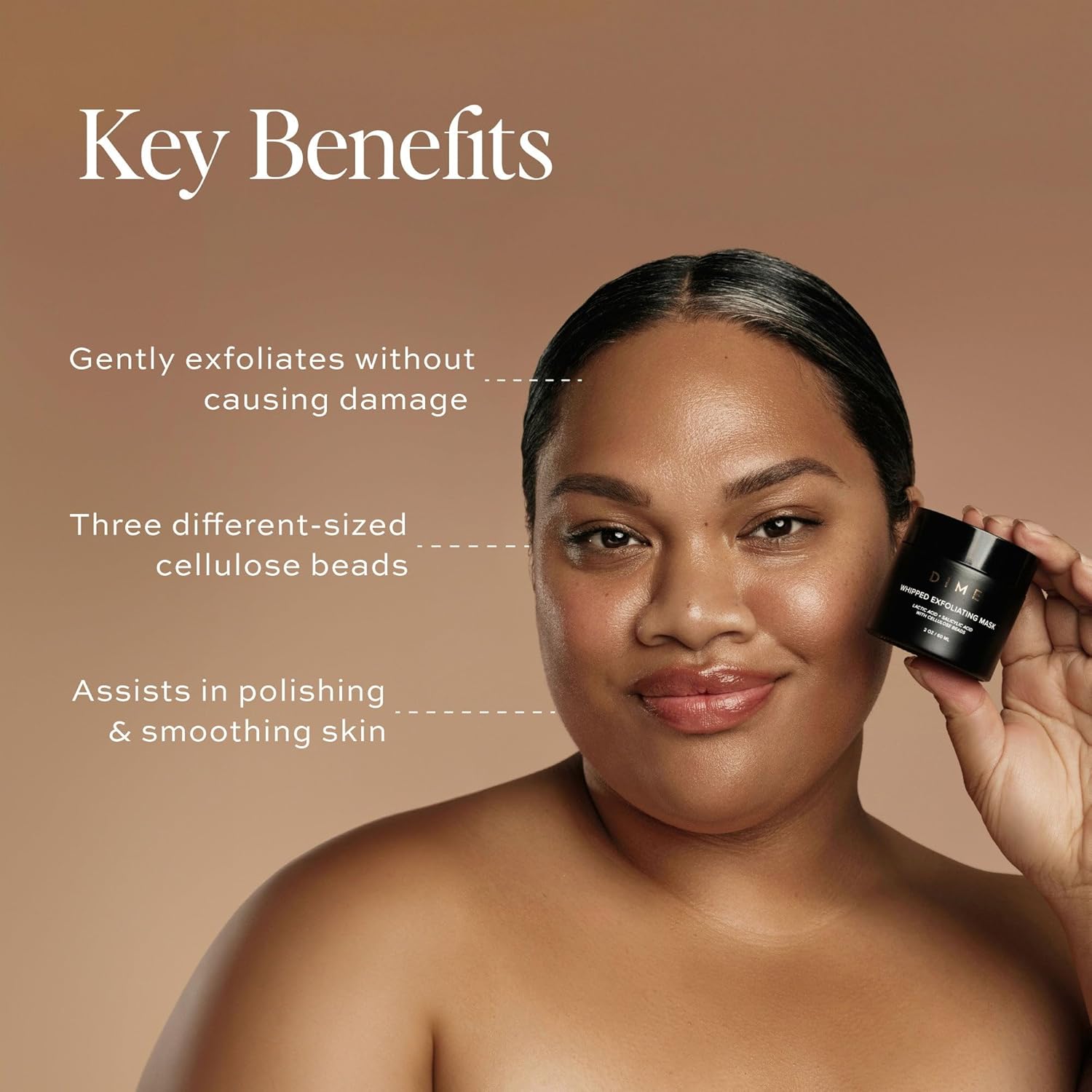 About this item GENTLE FACE EXFOLIATOR: Get the baby-soft skin you've always dreamed of with our Whipped Exfoliating Mask. Our innovative three-sized-cellulose-bead technology helps remove dead skin and impurities without damaging the skin barrier or causing irritation. SPHERICAL CELLULOSE BEADS: We use three sizes of beads for a three-phase physical exfoliation. Large beads help to break up the stubborn dirt and skin cell buildup, while the smaller beads assist in polishing and smoothing the skin. EFFECTIVE INGREDIENTS: Paired with our superstar ingredients, salicylic acid, and lactic acid, these ingredients leave your skin feeling buttery soft, and refreshed. The perfect way to treat yourself and your skin! SUGGESTED USE: Typically used at night, after cleansing, and before toning. Apply to cleansed, damp skin and massage in circular motions for 60 seconds, avoiding the eye area. Leave on for 2-5 minutes. Rinse with lukewarm water and pat dry. For best results, exfoliate twice a week or when skin feels dull. THE DIME DIFFERENCE: At DIME Beauty, the difference is in the details. We stand apart with sustainable packaging, clean ingredients, vegan and cruelty-free formulas, and a focus on your well-being. In addition, each ingredient we use has a safe Environmental-Working-Group rating so you can use our products daily with confidence. › See more product details,GENTLE FACE EXFOLIATOR: Get the baby-soft skin you've always dreamed of with our Whipped Exfoliating Mask. Our innovative three-sized-cellulose-bead technology helps remove dead skin and impurities without damaging the skin barrier or causing irritation,SPHERICAL CELLULOSE BEADS: We use three sizes of beads for a three-phase physical exfoliation. Large beads help to break up the stubborn dirt and skin cell buildup, while the smaller beads assist in polishing and smoothing the skin,EFFECTIVE INGREDIENTS: Paired with our superstar ingredients, salicylic acid, and lactic acid, these ingredients leave your skin feeling buttery soft, and refreshed. The perfect way to treat yourself and your skin!,SUGGESTED USE: Typically used at night, after cleansing, and before toning. Apply to cleansed, damp skin and massage in circular motions for 60 seconds, avoiding the eye area. Leave on for 2-5 minutes. Rinse with lukewarm water and pat dry. For best results, exfoliate twice a week or when skin feels dull,THE DIME DIFFERENCE: At DIME Beauty, the difference is in the details. We stand apart with sustainable packaging, clean ingredients, vegan and cruelty-free formulas, and a focus on your well-being. In addition, each ingredient we use has a safe Environmental-Working-Group rating so you can use our products daily with confidence