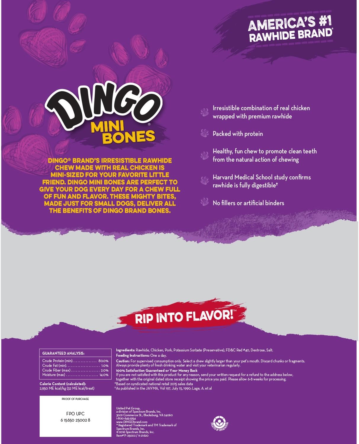 Combination Of Real Chicken Wrapped With Premium Rawhide10Packed With Protein10Promotes Clean Teeth From The Natural Action Of Chewing10Classic Bone Shaped Chew, Packed With Flavor10No Fillers Or Artificial Binders10Dingo BrandāS Real Meat And Rawhide Combinations Deliver Healthy And Delicious Chews To Promote Clean Teeth (Due To The Natural Action Of Chewing). These Premium Rawhide Chews Are Available In A Range Of Irresistibly Tasty Treats That Dogs Love.Dingo Mini Bones Are Irresistible Chews Made With Real Chicken In The Middle. These Mini-Sized Bones Are Made With The Highest-Quality Ingredients To Give Your Dog A Fun And Delicious Reward ThatāS Bursting With Flavor. Packed With Protein, This Irresistible Combination Of Real Chicken Wrapped With Premium Rawhide Is Perfect For Small And Toy Dog Breeds. With No Fillers Or Artificial Binders, These Healthy, Fun Chews Also Promote Clean Teeth From The Natural Action Of Chewing. Resealable Bag Contains 35 Mini Bones. Look For Other Fun Dingo Shapes And Sizes, Too.Give Your Dog Up To One Dingo Mini Bone Rawhide Chew Per Day. For Supervised Consumption Only. Select A Chew Slightly Larger Than Your PetāS Mouth. Discard Chunks Or Fragments. Always Provide Plenty Of Fresh Drinking Water And Visit Your Veterinarian Regularly.Dingo Brand Combines Powerful Flavors And Benefits To Create Bones, Chews And Treats That Are Sure To Keep You And Your Dog Wanting More. Shop Our Wide Variety Of Shapes And Flavors, With Options For Any Size Companion