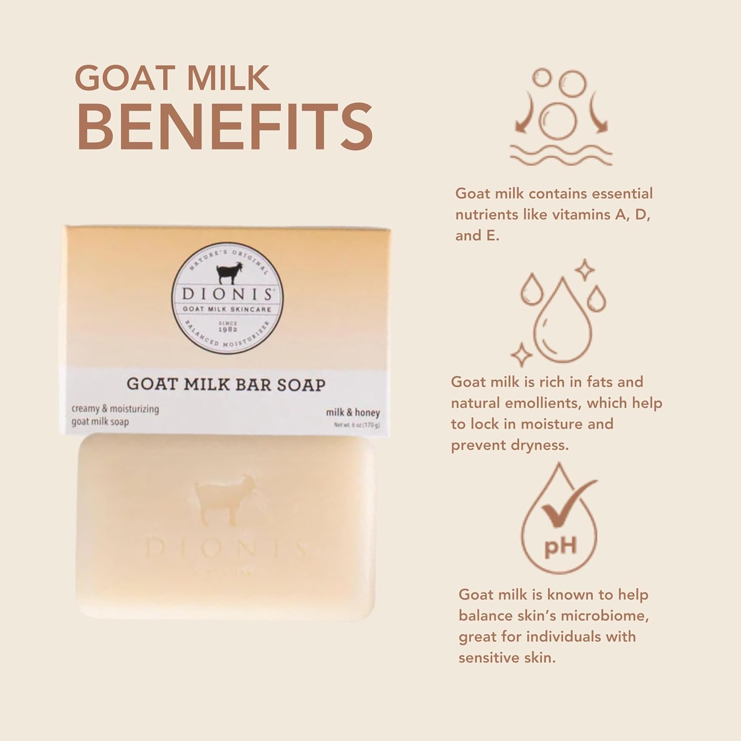 About this item 3 Times The Milk & Honey - A luxuriously fresh scent of rich, milky goodness and sweet honey straight from the comb, this bar soap is the perfect gift set for any gift basket, and every occasion; holidays, work events, and birthdays. Experience The Restorative Qualities - Triple milled, and blended with shea butter and olive oil, our bath soaps gently moisturize your skin without the greasy residue some soaps leave. No "squeaky" dry skin here, just soft, nourished skin! Nature's Richest Ingredient - Goat milk is naturally enriched with high amounts of protein, fat, iron, and lots of vitamins; making it the best way to moisturize. Because goat milk has a pH like that of human skin, our goat milk products offer one of the best ways to cleanse and moisturize the skin, without the greasy residue. Great For All Skin Types - Dionis products are dermatologist tested, cruelty-free paraben-free, gluten-free, sulfate-free, and made in the USA. For extra sensitive skin, try our unscented options. Feel good about feeling good with Dionis Goat Milk Skincare Products. Responsibly Sourced - Our goat milk is sourced from privately-owned family farms in the United States. These dairy goats are fed a balanced, vegetarian diet, which is full of nutrients, and free of antibiotics, hormones, animal by-products, and preservatives. This bar soap is also packaged in a recyclable box for the most sustainable solution for cleansing and nurturing your body. › See more product details,3 Times The Milk & Honey - A luxuriously fresh scent of rich, milky goodness and sweet honey straight from the comb, this bar soap is the perfect gift set for any gift basket, and every occasion; holidays, work events, and birthdays,Experience The Restorative Qualities - Triple milled, and blended with shea butter and olive oil, our bath soaps gently moisturize your skin without the greasy residue some soaps leave. No "squeaky" dry skin here, just soft, nourished skin!,Nature's Richest Ingredient - Goat milk is naturally enriched with high amounts of protein, fat, iron, and lots of vitamins; making it the best way to moisturize. Because goat milk has a pH like that of human skin, our goat milk products offer one of the best ways to cleanse and moisturize the skin, without the greasy residue,Great For All Skin Types - Dionis products are dermatologist tested, cruelty-free paraben-free, gluten-free, sulfate-free, and made in the USA. For extra sensitive skin, try our unscented options. Feel good about feeling good with Dionis Goat Milk Skincare Products,Responsibly Sourced - Our goat milk is sourced from privately-owned family farms in the United States. These dairy goats are fed a balanced, vegetarian diet, which is full of nutrients, and free of antibiotics, hormones, animal by-products, and preservatives. This bar soap is also packaged in a recyclable box for the most sustainable solution for cleansing and nurturing your body