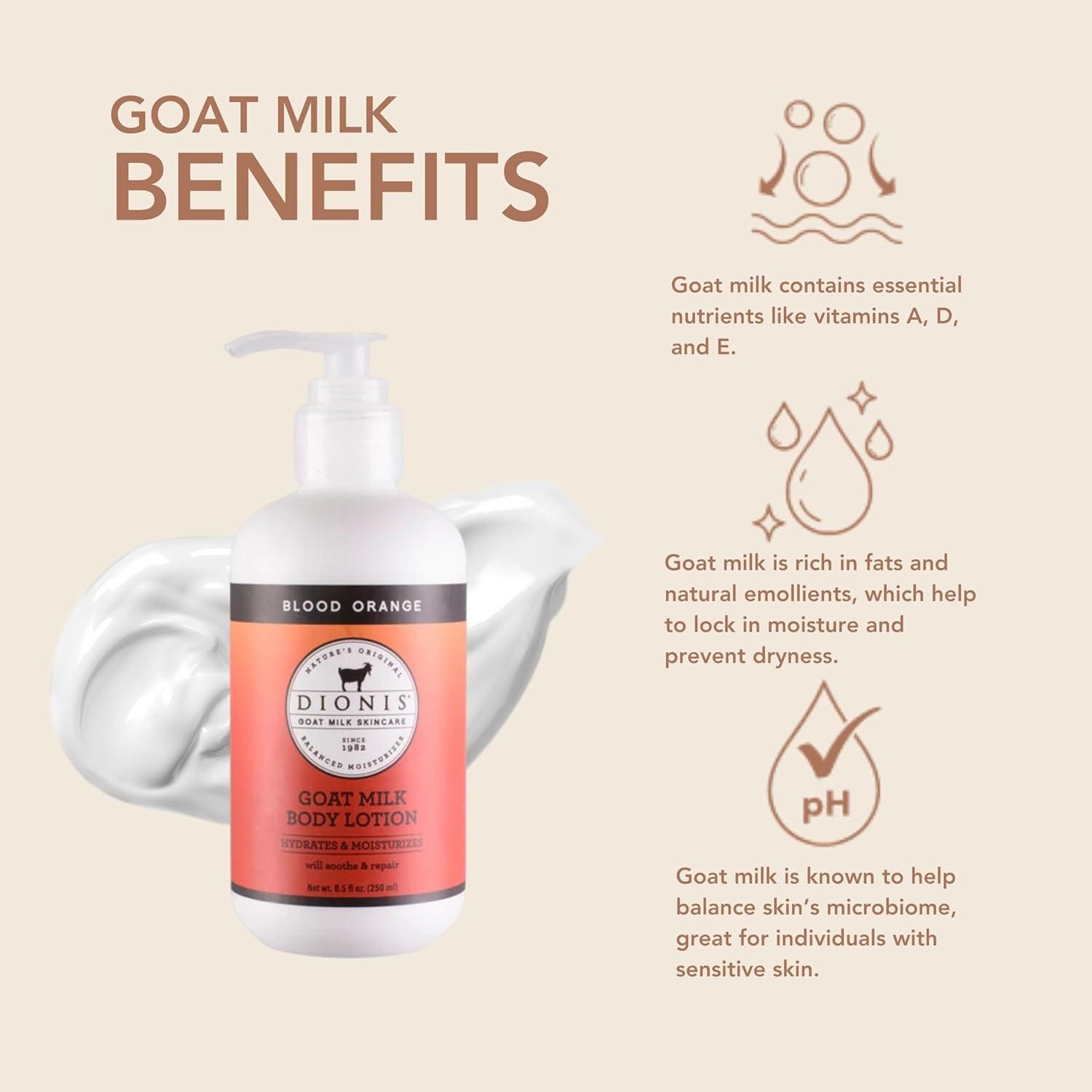 About this item Hydrating Moisturizer - Treat yourself with Dionis' body moisturizing lotion. A soft creamy texture, light in fragrance but rich in moisture will leave you feeling pampered. Generously apply to skin until well absorbed. Used daily, this rich, non-greasy formula will leave your skin feeling hydrated and silky smooth. Skin's Best Friend - The Dionis Goat Milk Skincare Lotion is rich and creamy. With regular use it’s designed to ease rough skin, making it smooth and silky. It also does not leave a greasy residue like many lotions, so you can apply it right before putting on your favorite sweater. Nature's Richest Ingredient - Goat milk is naturally enriched with high amounts of protein, fat, iron, and lots of vitamins; making it the best way to moisturize. Because goat milk has a pH like that of human skin, our goat milk products offer one of the best ways to cleanse and moisturize the skin, without the greasy residue. Great For All Skin Types - Dionis products are dermatologist tested, cruelty free, paraben free, gluten free, sulfate free, and made in the USA. For extra sensitive skin, try our unscented options. Feel good about feeling good with Dionis Goat Milk Skincare Products. Responsibly Sourced - Our goat milk is sourced from privately-owned family farms in the United States. These dairy goats are fed a balanced, vegetarian diet, which is full of nutrients, and free of antibiotics, hormones, animal by-products, and preservatives. › See more product details,Hydrating Moisturizer - Treat yourself with Dionis' body moisturizing lotion. A soft creamy texture, light in fragrance but rich in moisture will leave you feeling pampered. Generously apply to skin until well absorbed. Used daily, this rich, non-greasy formula will leave your skin feeling hydrated and silky smooth,Skin's Best Friend - The Dionis Goat Milk Skincare Lotion is rich and creamy. With regular use it’s designed to ease rough skin, making it smooth and silky. It also does not leave a greasy residue like many lotions, so you can apply it right before putting on your favorite sweater,Nature's Richest Ingredient - Goat milk is naturally enriched with high amounts of protein, fat, iron, and lots of vitamins; making it the best way to moisturize. Because goat milk has a pH like that of human skin, our goat milk products offer one of the best ways to cleanse and moisturize the skin, without the greasy residue,Great For All Skin Types - Dionis products are dermatologist tested, cruelty free, paraben free, gluten free, sulfate free, and made in the USA. For extra sensitive skin, try our unscented options. Feel good about feeling good with Dionis Goat Milk Skincare Products,Responsibly Sourced - Our goat milk is sourced from privately-owned family farms in the United States. These dairy goats are fed a balanced, vegetarian diet, which is full of nutrients, and free of antibiotics, hormones, animal by-products, and preservatives