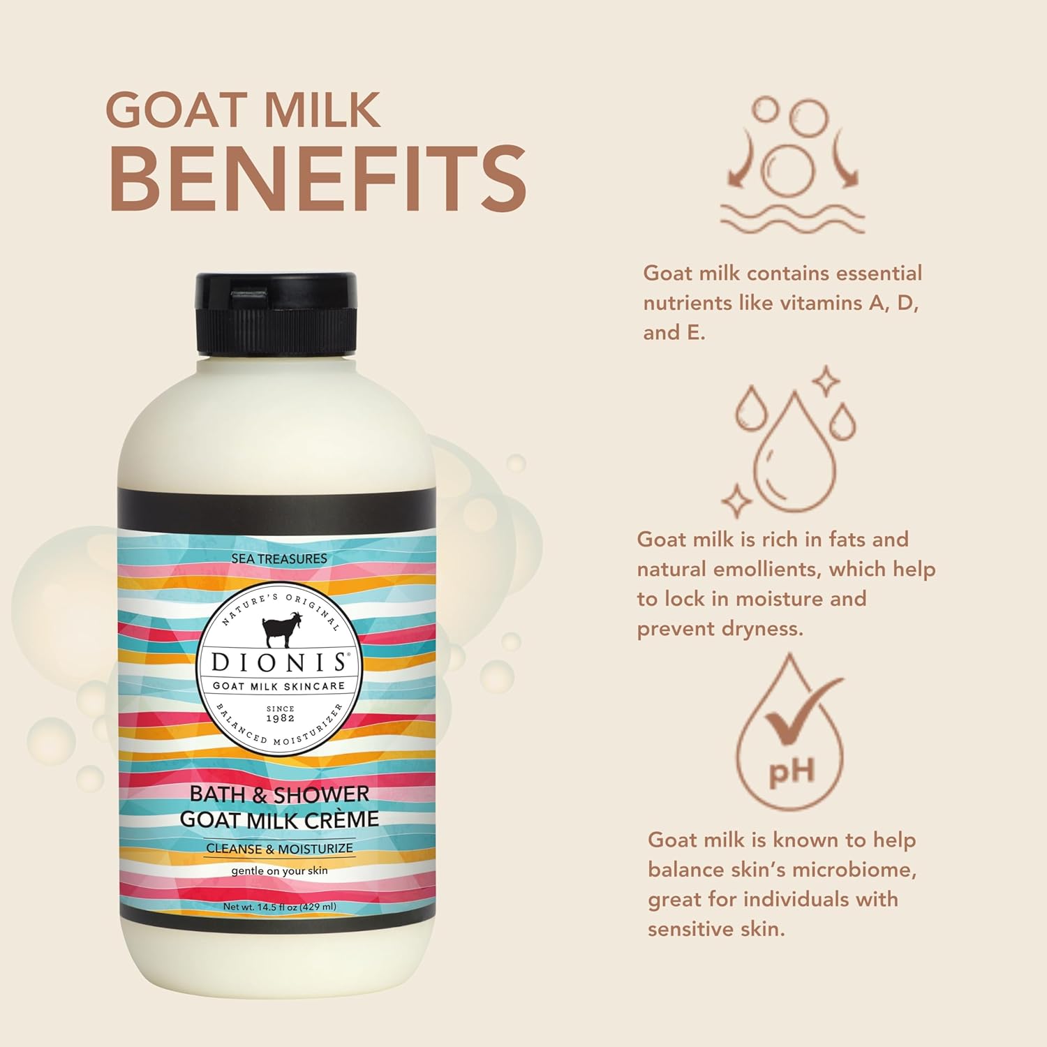 About this item Upgrade Your Bath & Shower - Enjoy an indulgent bath and shower experience with Dionis Sea Treasures Goat Milk Crème, now available in a larger bottle for your convenience. Luxurious Sea Treasures Fragrance - Immerse yourself in the refreshing and uplifting scent of Sea Treasures, evoking the essence of ocean breezes and sun-kissed shores with every use. Goat Milk for Skin Health - Indulge in the natural richness of goat milk, a powerhouse of vitamins and nutrients including A, C, D, E, and B complex, as well as lipids and triglycerides. Harnessing the natural goodness of goat milk our body wash preserves your skin's microbiome, promoting moisture and suppleness. Cleanse Gently - Rest easy knowing our formula is cruelty-free, dermatologist-tested, and free from parabens and sulfates, ensuring a gentle yet effective cleansing experience. Embrace Nature's Goodness - Let your skin revel in the gentle care of our crème, which preserves its delicate balance while imparting a touch of luxurious pampering. With each application, feel the embrace of clean, wholesome ingredients that nourish and protect, leaving your skin feeling refreshed, revitalized, and irresistibly soft. › See more product details,Upgrade Your Bath & Shower - Enjoy an indulgent bath and shower experience with Dionis Sea Treasures Goat Milk Crème, now available in a larger bottle for your convenience,Luxurious Sea Treasures Fragrance - Immerse yourself in the refreshing and uplifting scent of Sea Treasures, evoking the essence of ocean breezes and sun-kissed shores with every use,Goat Milk for Skin Health - Indulge in the natural richness of goat milk, a powerhouse of vitamins and nutrients including A, C, D, E, and B complex, as well as lipids and triglycerides. Harnessing the natural goodness of goat milk our body wash preserves your skin's microbiome, promoting moisture and suppleness,Cleanse Gently - Rest easy knowing our formula is cruelty-free, dermatologist-tested, and free from parabens and sulfates, ensuring a gentle yet effective cleansing experience,Embrace Nature's Goodness - Let your skin revel in the gentle care of our crème, which preserves its delicate balance while imparting a touch of luxurious pampering. With each application, feel the embrace of clean, wholesome ingredients that nourish and protect, leaving your skin feeling refreshed, revitalized, and irresistibly soft