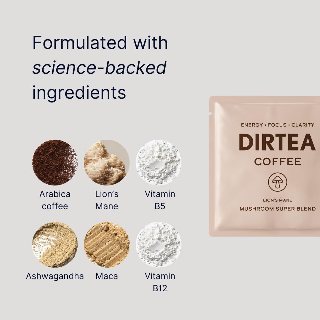 Dirtea Matcha Powder Sachets - 100% Organic Ceremonial Grade Matcha From Japan - Mushrooms Super Blend Tea With Lions Mane & Tremella - 2,500Mg Per Serving - Organic 42G - 7 Sachets X 6G Servings