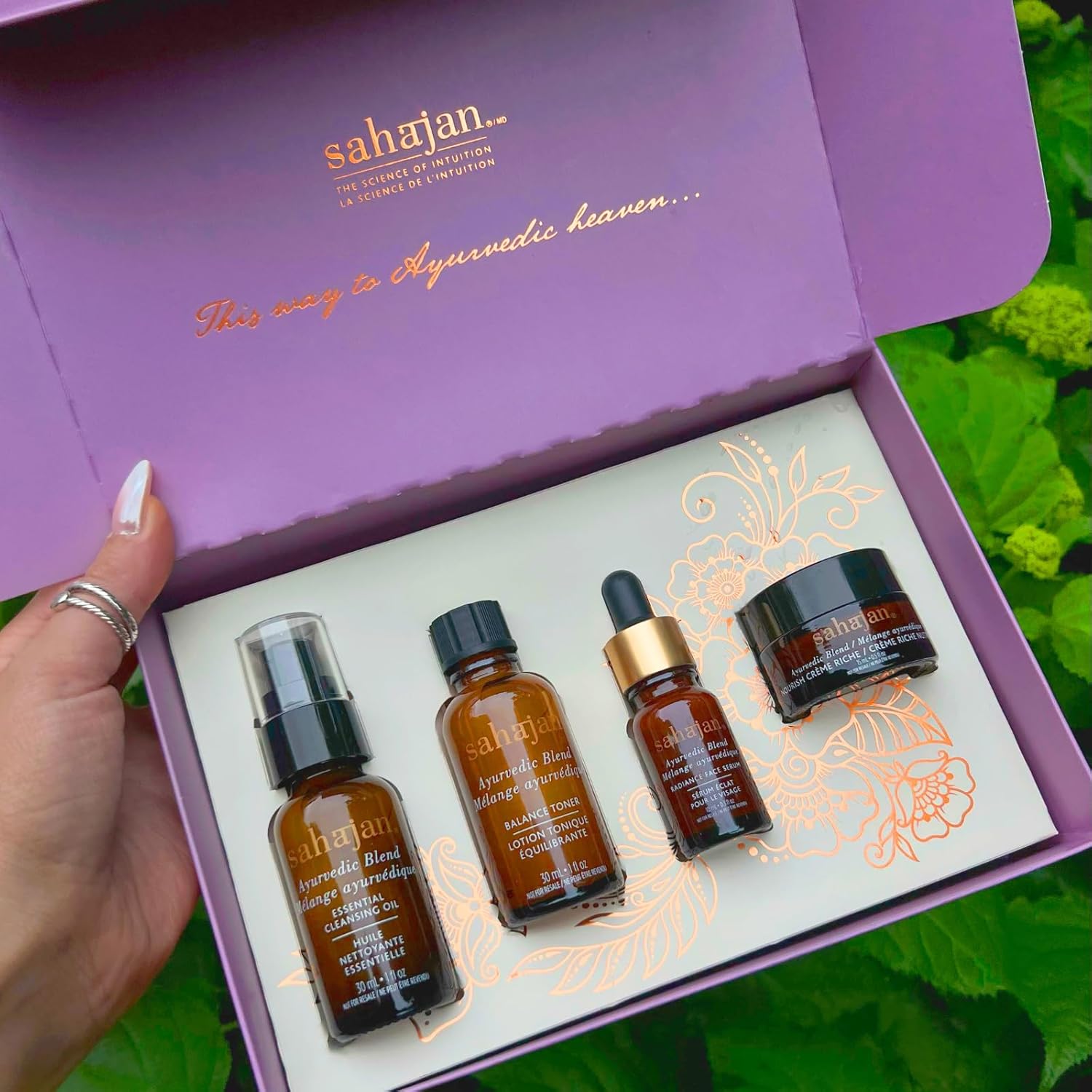 About this item Sahajan Discovery Gift Set: Experience the transformative power of Ayurvedic facial care with this exquisite gift set containing four essential products. Each blend is carefully crafted to emphasize your skin's natural beauty and provide a luxurious self-care experience. Essential Cleansing Oil (30 ml): Gently remove impurities and makeup with this nourishing oil cleanser. Infused with Ayurvedic botanicals, it purifies the skin without stripping away essential moisture, leaving your face feeling refreshed and rejuvenated. Balance Toner (30 ml): Restore harmony to your skin with this balancing toner. Helps to refine pores, regulate oil production, and promote a clear complexion. Radiance Face Serum (10 ml): Unleash your skin's natural radiance with this potent face serum. Packed with powerful antioxidants and skin-loving ingredients, it helps to brighten dull skin, reduce the appearance of fine lines, and improve overall skin texture. Experience a youthful glow with every drop. Nourish Creme Riche (15 ml): Indulge your skin in rich hydration with this nourishing face cream. Deeply moisturizes and replenishes the skin, leaving it soft, supple, and deeply nourished. Perfect for dry or mature skin types. See more product details,Sahajan Discovery Gift Set: Experience the transformative power of Ayurvedic facial care with this exquisite gift set containing four essential products. Each blend is carefully crafted to emphasize your skin's natural beauty and provide a luxurious self-care experience,Essential Cleansing Oil (30 ml): Gently remove impurities and makeup with this nourishing oil cleanser. Infused with Ayurvedic botanicals, it purifies the skin without stripping away essential moisture, leaving your face feeling refreshed and rejuvenated,Balance Toner (30 ml): Restore harmony to your skin with this balancing toner. Helps to refine pores, regulate oil production, and promote a clear complexion,Radiance Face Serum (10 ml): Unleash your skin's natural radiance with this potent face serum. Packed with powerful antioxidants and skin-loving ingredients, it helps to brighten dull skin, reduce the appearance of fine lines, and improve overall skin texture. Experience a youthful glow with every drop,Nourish Creme Riche (15 ml): Indulge your skin in rich hydration with this nourishing face cream. Deeply moisturizes and replenishes the skin, leaving it soft, supple, and deeply nourished. Perfect for dry or mature skin types