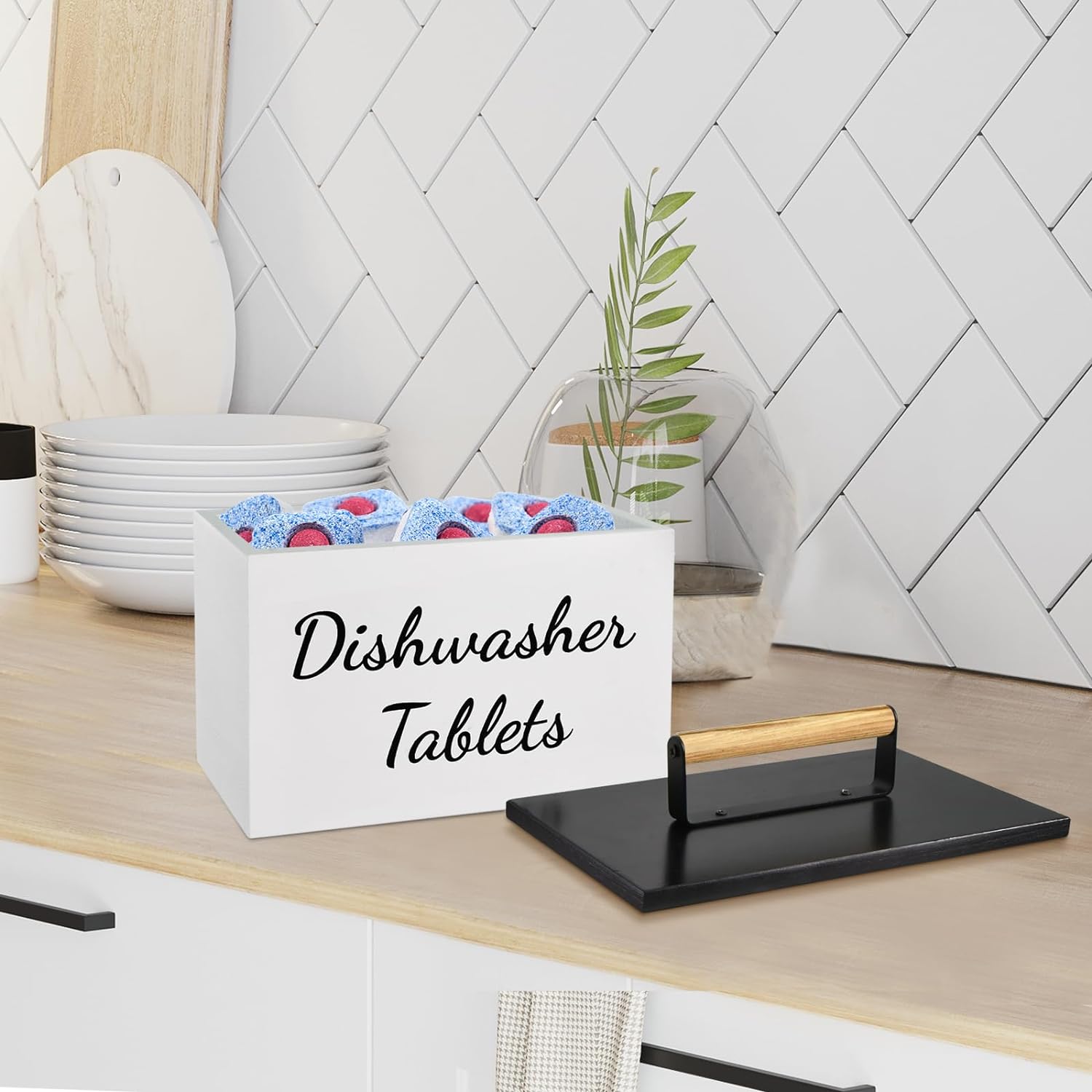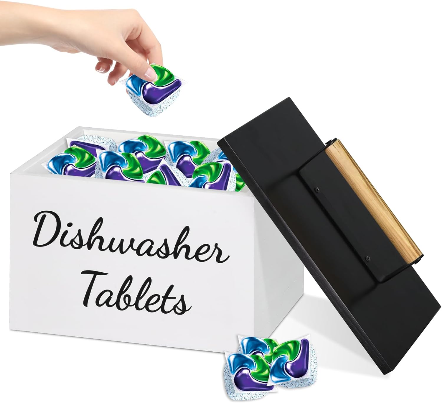 ??Large Capacity&Saving Your Kitchen Space?-Our dishwasher pods container measures 8.6?L x 6?W x 5.5”H and has a large capacity, which can capable of holding at least 60 dishwasher detergent pods. It can greatly save your space and keep the kitchen clean and tidy at all times. In addition, this dishwasher tablet container can make you enjoy the convenience of keeping your dishwasher pods on the countertop, and you don't have to bend over and dig under the sink to grab a dishwasher tab anymore10??Multi-use Dishwasher Detergent Container?-Our wood dishwasher tablet holder can not only be used to store all sizes of dishwasher salt or pods, it can also be used to organize various necessities such as laundry pods, dryer sheets, pegs, dryer balls, etc. The lid will keep your room neat, won't see the launder detergent pod inside, and will keep the pod fresh. Put this dishwasher pod storage holder in the kitchen, laundry room, perfect for your various accessories10??Beautiful for Rustic Kitchen Decor?-This dishwasher pod container is designed with white surface and black lid, simple and elegant, which can be well adapted to your various home styles. The handle is made of pine wood and is very non-slip, which is convenient for you to take the dishwasher cleaner tablets every day. The cute "Dishwasher Tablet" printed on the front makes this dishwasher container an eye-catching focal point whether displayed on your countertop or stored in your pantry10??High Quality & Fine Workmanship?-The dishwasher pods storage container for kitchen decor and accessories is made of high-quality wood without bad smell, which is not easy to deform for long term use. Smooth interior and surface make it easy to clean, just wipe with a damp cloth. Big size opening makes laundry detergent container easily access to get the item you want. If you are looking for a high quality kitchen organization, our dishwasher detergent holder is a good choice for you10??Best Gift Choice & Service Guarantee?-Do you want to surprise your family or friends? Our dishwasher tablets storage container will be the best gift at housewarming, Thanksgiving Day, Christmas or birthday party. I believe that everyone who receives this dishwasher detergent holder will love it. Unistyle has always been aiming at providing the best kitchen storage organizer. Any issues, please feel free to contact us, and we will provide the best service to you!