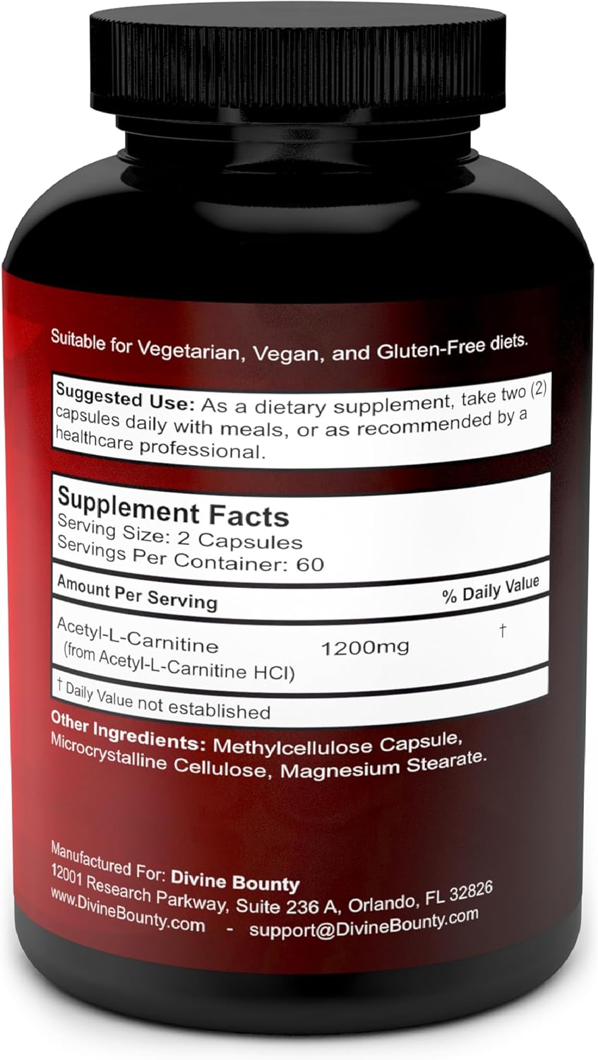 Divine Bounty Acetyl L-Carnitine Capsules 1200Mg Per Serving - L Carnitine Supplement 120 Vegetarian Capsules