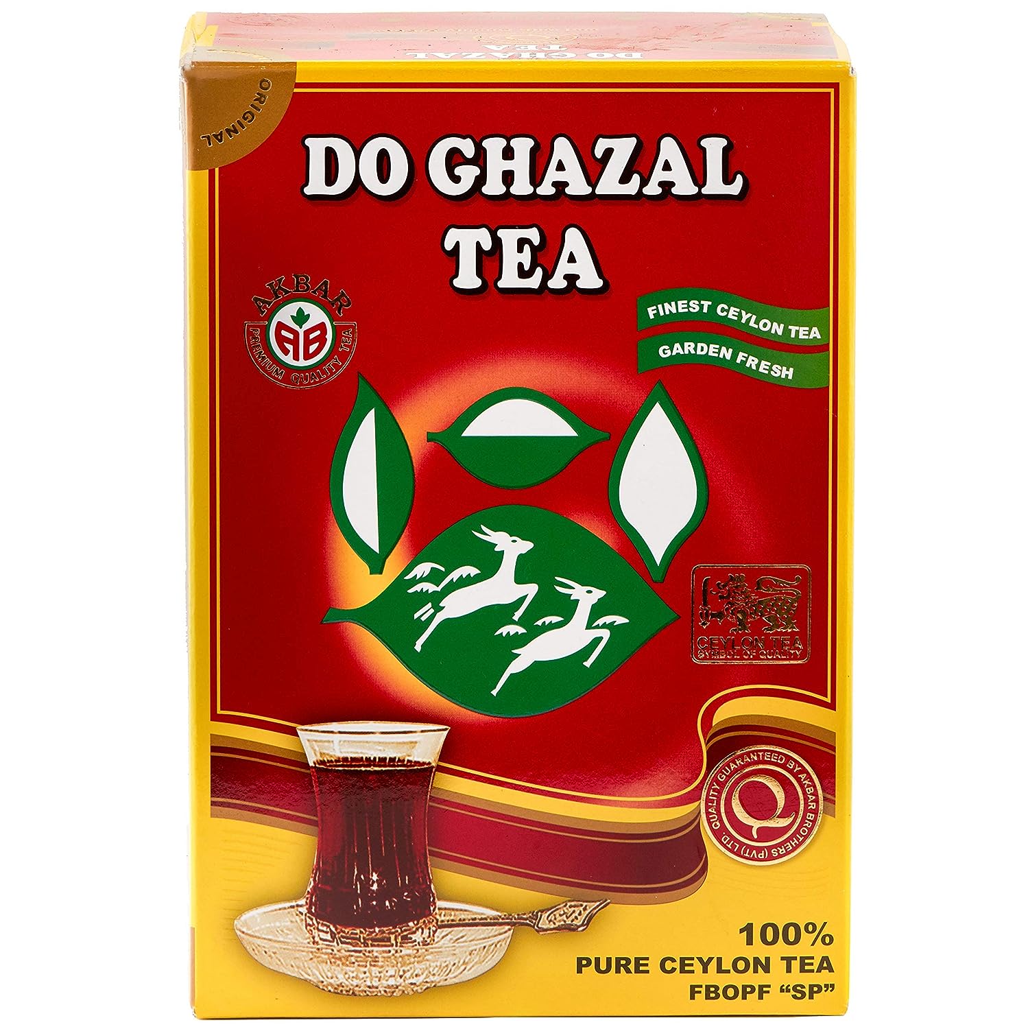 Do Ghazal Pure Ceylon Tea - 16oz (454g) Authentic Black Loose Tea Leaves Do Ghazal Pure Ceylon Tea is a premium black tea brand by Akbar Brothers, a leading company with a century-long experience in the industry. Sourced from central highlands of Sri Lanka, the tea leaves are a blend of FBOPF tea grade and golden tips, creating a strong, bright color and a body with briskness and malty flavor. Rich in antioxidants, Do Ghazal Pure Ceylon Tea comes in a 16oz (454g) BPA-free box and is a versatile choice for any tea enthusiast. Each box is crafted with care by Akbar Brothers, the parent company, using a time-honored process that reflects the brand's commitment to quality. The brand's name takes inspiration from the two deer depicted on its logo, and its rich and authentic flavor provides a true taste of Sri Lanka's exotic Ceylon teas. Do Ghazal Premium Black Tea Crafted with Care Do Ghazal Pure Ceylon Tea is a premium brand of black tea produced by Akbar Brothers, a leading tea company that has been in the tea industry for over a century. As the parent company of Do Ghazal, Akbar Brothers ensures that each 16oz (454g) box of tea leaves is crafted with care and precision, using a time-honored process that has been passed down through generations of tea makers. Exotic and Authentic Flavor The brand takes its name from the two deer that are depicted on its logo, and it is sourced from the central highland regions of Sri Lanka, where the climate and soil are ideal for producing premium teas. The tea leaves are a blend of Finest Broken Orange Pekoe Fanning (FBOPF) tea grade and golden tips, creating a strong, bright color and a body with briskness and malty flavor that are highly valued among Sri Lanka's teas