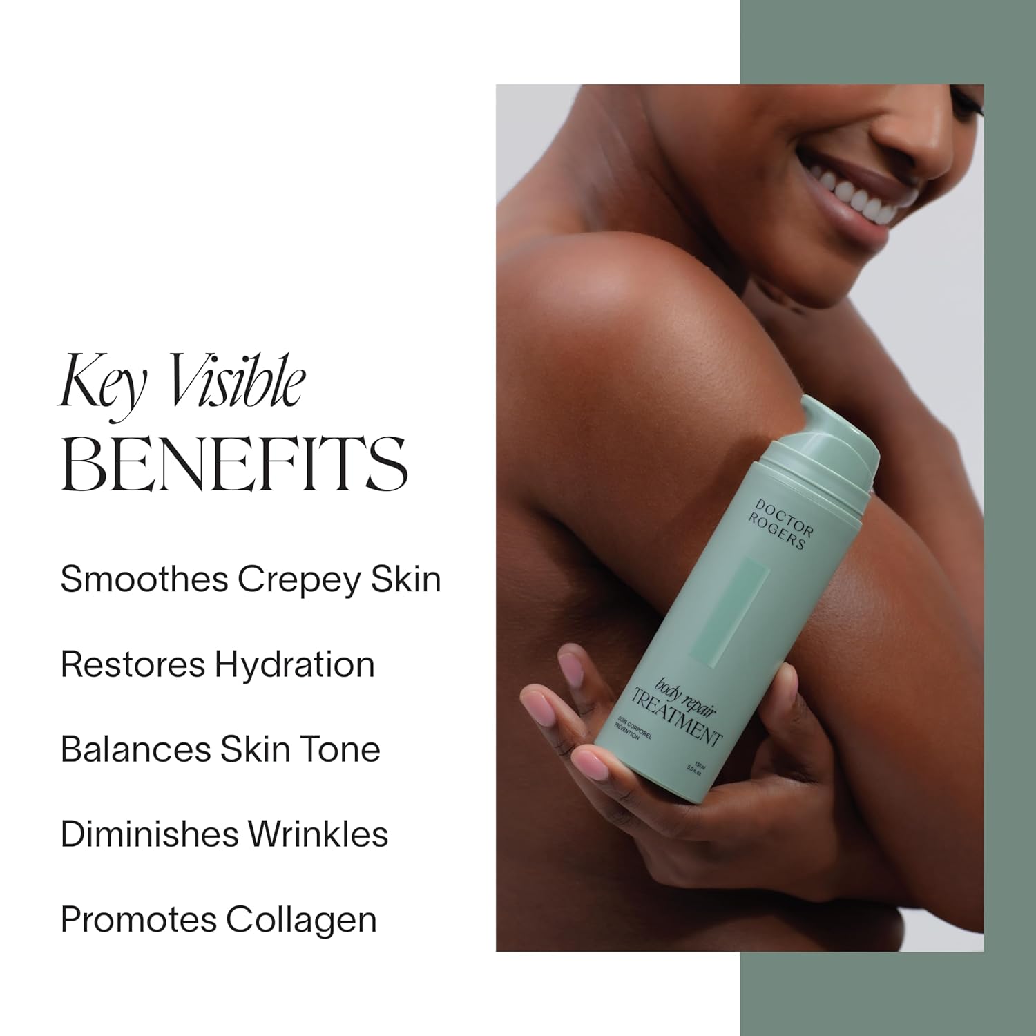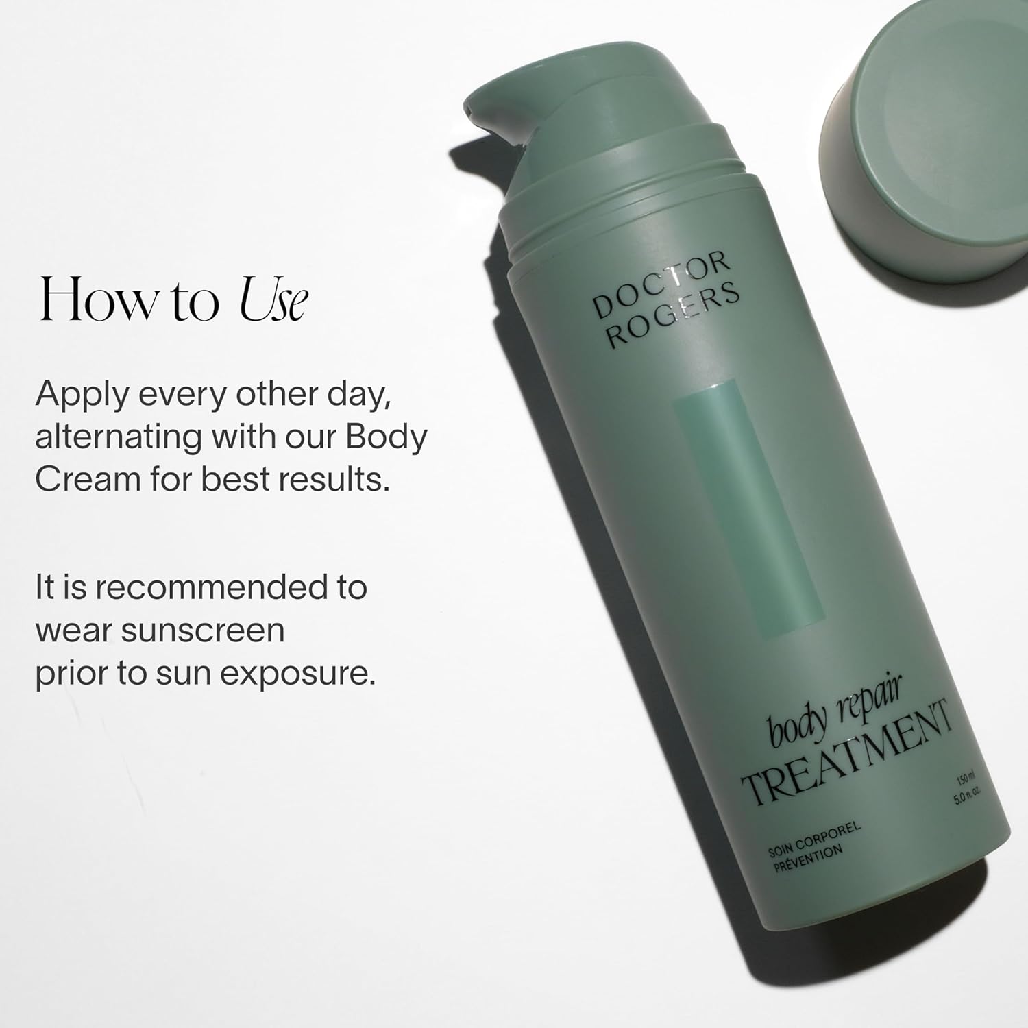About this item Body Repair Treatment: A fast-absorbing corrective serum smooths crepey skin, restores hydration & balances skin. Glycolic Acid to exfoliate & smooth texture, Squalane & Shea butter to deeply moisturize Powered by Glycolic Acid 7% & Gluconolactone 5% to exfoliate and refine, Bakuchiol 0.5%, a gentle yet effective retinol alternative, to boost collagen and firm, plus squalane and shea butter for deep nourishment & superior tolerability Squalane moisturizers & conditions skin, restoring fatty acids & antioxidants while glycerin draws water to hydrate the skin, speeds healing, reduces irritation & restores the skin barrier Use once daily to improve uneven skin tone & texture. This treatment serum builds collagen while diminishing wrinkles and dark spots. Skin looks and feels soft, supple and visibly smoother within days of use. We recommend every other day application, alternating with our Body Cream for best results SKINCARE ESSENTIALS: Doctor Rogers understands healthy & radiant skin instills confidence. Our products are formulated to support skin using only effective plant-derived hypoallergenic, cruelty-free, vegan & biodegradable ingredients to achieve outstanding results › See more product details,Body Repair Treatment: A fast-absorbing corrective serum smooths crepey skin, restores hydration & balances skin. Glycolic Acid to exfoliate & smooth texture, Squalane & Shea butter to deeply moisturize,Powered by Glycolic Acid 7% & Gluconolactone 5% to exfoliate and refine, Bakuchiol 0.5%, a gentle yet effective retinol alternative, to boost collagen and firm, plus squalane and shea butter for deep nourishment & superior tolerability,Squalane moisturizers & conditions skin, restoring fatty acids & antioxidants while glycerin draws water to hydrate the skin, speeds healing, reduces irritation & restores the skin barrier,Use once daily to improve uneven skin tone & texture. This treatment serum builds collagen while diminishing wrinkles and dark spots. Skin looks and feels soft, supple and visibly smoother within days of use. We recommend every other day application, alternating with our Body Cream for best results,SKINCARE ESSENTIALS: Doctor Rogers understands healthy & radiant skin instills confidence. Our products are formulated to support skin using only effective plant-derived hypoallergenic, cruelty-free, vegan & biodegradable ingredients to achieve outstanding results