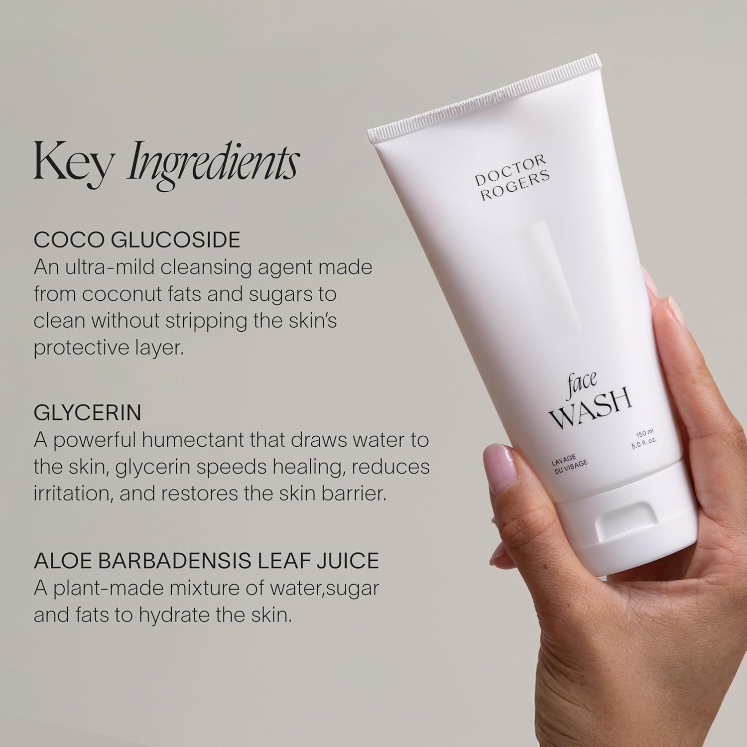 About this item GENTLE & EFFECTIVE: Easily remove makeup, sunscreen & grime without stripping skin of its natural protection. A gentle, effective face wash designed to deeply cleanse your skin while maintaining its natural balance pH BALANCED: With a pH of 5.25 it is perfectly balanced to help maintain your skin's natural barrier function and protect itself from environmental stressors CLEANSER FOR ALL SKIN TYPES: Our face wash can be used on all skin types, sensitive, dry, normal, combination, and oily skin; It's safe for healing, fragile skin. Dermatologist created GREEN FORMULA: Our plant-based ingredients make this cleanser a safe choice for your skincare routine. Our formula includes aloe vera juice, coco, decyl glucoside, xanthan gum, leuconostoc/radish root ferment filtrate, caprylyl glycol, and citric acid SKINCARE ESSENTIALS: Doctor Rogers understands healthy & radiant skin instills confidence. Our products are formulated to support skin using only effective plant-derived hypoallergenic, non-comedogenic, cruelty-free, vegan & biodegradeable ingredients to achieve outstanding results › See more product details,GENTLE & EFFECTIVE: Easily remove makeup, sunscreen & grime without stripping skin of its natural protection. A gentle, effective face wash designed to deeply cleanse your skin while maintaining its natural balance,pH BALANCED: With a pH of 5.25 it is perfectly balanced to help maintain your skin's natural barrier function and protect itself from environmental stressors,CLEANSER FOR ALL SKIN TYPES: Our face wash can be used on all skin types, sensitive, dry, normal, combination, and oily skin; It's safe for healing, fragile skin. Dermatologist created,GREEN FORMULA: Our plant-based ingredients make this cleanser a safe choice for your skincare routine. Our formula includes aloe vera juice, coco, decyl glucoside, xanthan gum, leuconostoc/radish root ferment filtrate, caprylyl glycol, and citric acid,SKINCARE ESSENTIALS: Doctor Rogers understands healthy & radiant skin instills confidence. Our products are formulated to support skin using only effective plant-derived hypoallergenic, non-comedogenic, cruelty-free, vegan & biodegradeable ingredients to achieve outstanding results