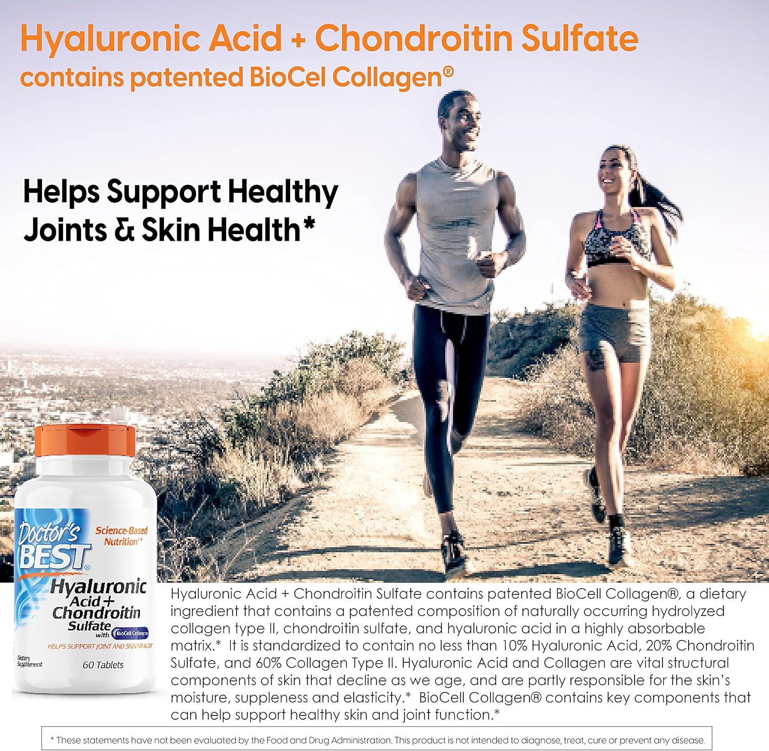 About this item Doctor's Best Hyaluronic Acid with Chondroitin Sulfate featuring BioCell Collagen supports healthy joint structure and youthful skin BioCell Collagen is a proven dietary ingredient that contains a patented composition of naturally occurring hydrolyzed collagen type II (60%), chondroitin sulfate (20%), and hyaluronic acid (10%) in a highly absorbable matrix Clinically proven to help to maintain joint shock absorption and cushioning Helps maintain youthful skin by enhancing the structure and volume of the skin by promoting connective tissues Non-GMO and Gluten Free › See more product details,Doctor's Best Hyaluronic Acid with Chondroitin Sulfate featuring BioCell Collagen supports healthy joint structure and youthful skin,BioCell Collagen is a proven dietary ingredient that contains a patented composition of naturally occurring hydrolyzed collagen type II (60%), chondroitin sulfate (20%), and hyaluronic acid (10%) in a highly absorbable matrix,Clinically proven to help to maintain joint shock absorption and cushioning,Helps maintain youthful skin by enhancing the structure and volume of the skin by promoting connective tissues,Non-GMO and Gluten Free