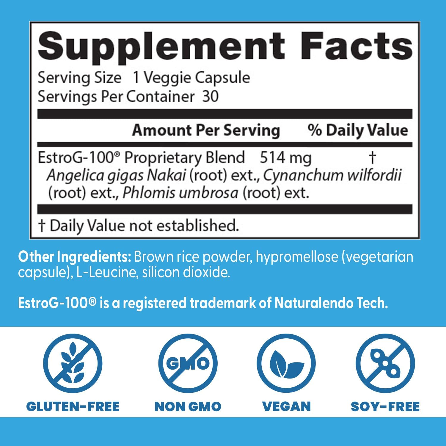 About this item EstroG-100 is clinically proven to provide relief from hot flashes, help manage mood & energy swings, help alleviate night sweats and promote restful sleep, and improve vaginal dryness Clinical studies show that EstroG-100 has no estrogenic effect and, unlike hormone replacement therapy, it does not affect weight or body mass index Gluten Free, Non-GMO, Veggie Capsule › See more product details,EstroG-100 is clinically proven to provide relief from hot flashes, help manage mood & energy swings, help alleviate night sweats and promote restful sleep, and improve vaginal dryness,Clinical studies show that EstroG-100 has no estrogenic effect and, unlike hormone replacement therapy, it does not affect weight or body mass index,Gluten Free, Non-GMO, Veggie Capsule