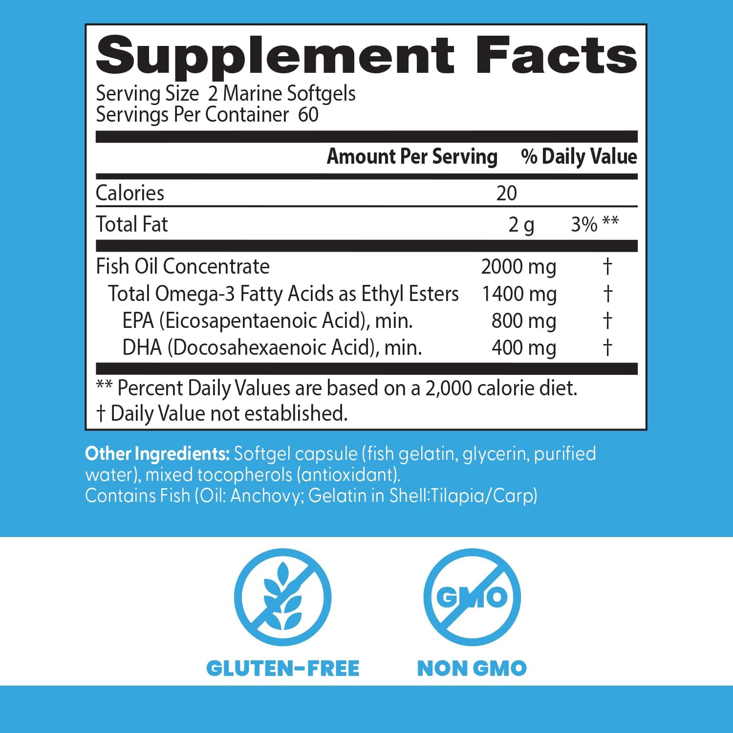 Package Dimensions : 2.9 x 2.9 x 5.22 inches Special Ingredients Contains Fish (Oil: Anchovy Gelatin: Tilapia/ Diet Type Gluten Free Product Benefits Bone & Joint Support