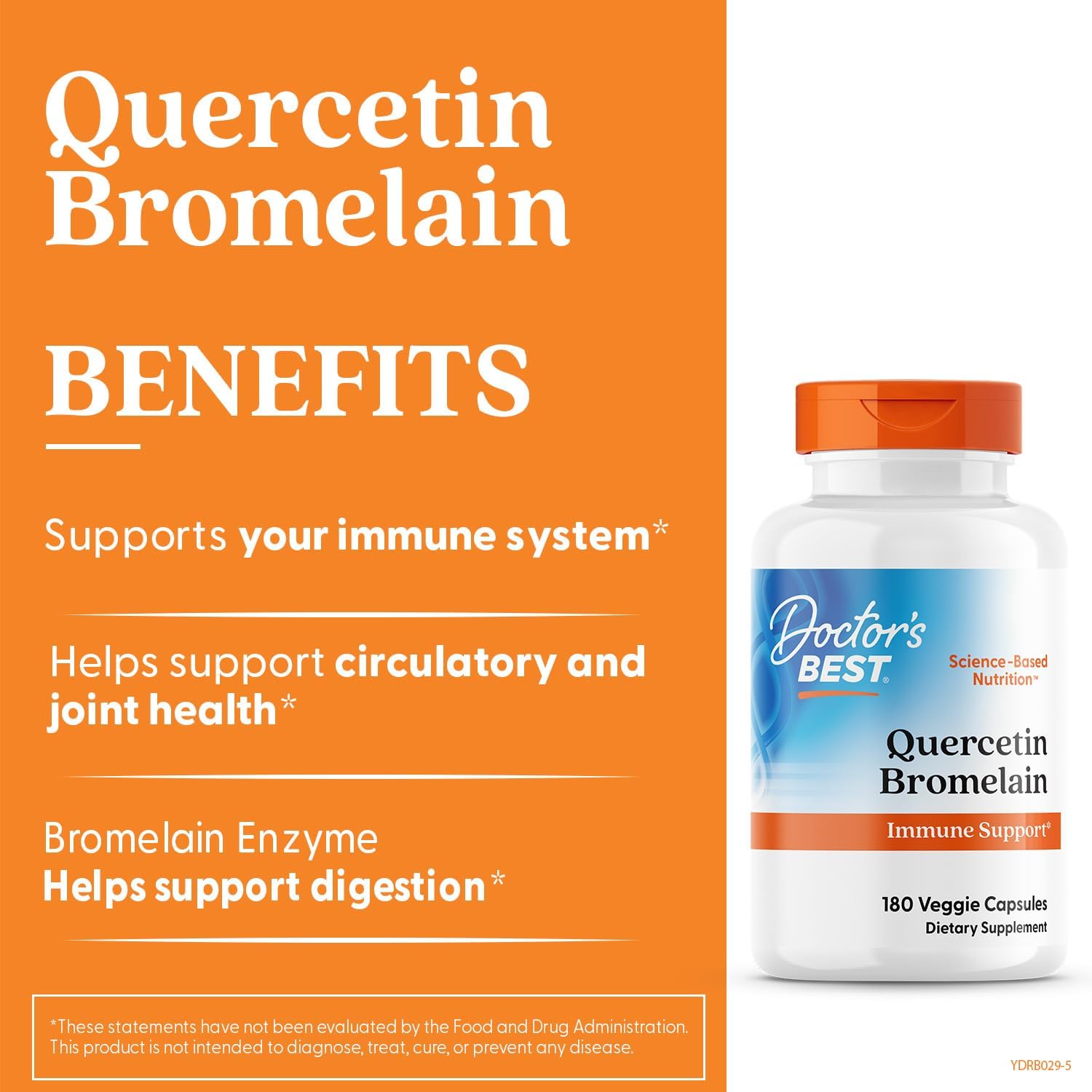 About this item QUERCETIN BROMELAIN BENEFITS - Doctor's Best Quercetin with Bromelain help support immune health, heart health, joint comfort, healthy digestions, respiratory health and supporting overall well-being. BALANCED IMMUNE SYSTEM - Quercetin is a dietary flavonoid found in fruits and vegetables has powerful antioxidant properties. Quercetin is renowned for supporting healthy seasonal immune system function. WITH BROMELAIN - Bromelain is a natrually occurring enzyme from pineapple stems that helps increase the bioavailability and benefits of the flavonoid Quercetin. Bromelain is known to help support a balanced immune system response. DIETARY SUPPLEMENT - Doctor's Best Quercetin Bromelain contains high potency Bromelain 3000 GDU per capsule, has 500 mg Quercetin with 250 mg Bromelain in a serving size of 2 Veggie Capsules. Non-GMO, Vegan, Gluten Free, Soy Free. IMPORTANT NOTE - Exposure to heat or sunlight may lead to melting/damage of product. Hence customers are expected to be available during the product delivery. › See more product details,QUERCETIN BROMELAIN BENEFITS - Doctor's Best Quercetin with Bromelain help support immune health, heart health, joint comfort, healthy digestions, respiratory health and supporting overall well-being,BALANCED IMMUNE SYSTEM - Quercetin is a dietary flavonoid found in fruits and vegetables has powerful antioxidant properties. Quercetin is renowned for supporting healthy seasonal immune system function,WITH BROMELAIN - Bromelain is a natrually occurring enzyme from pineapple stems that helps increase the bioavailability and benefits of the flavonoid Quercetin. Bromelain is known to help support a balanced immune system response,DIETARY SUPPLEMENT - Doctor's Best Quercetin Bromelain contains high potency Bromelain 3000 GDU per capsule, has 500 mg Quercetin with 250 mg Bromelain in a serving size of 2 Veggie Capsules. Non-GMO, Vegan, Gluten Free, Soy Free,IMPORTANT NOTE - Exposure to heat or sunlight may lead to melting/damage of product. Hence customers are expected to be available during the product delivery
