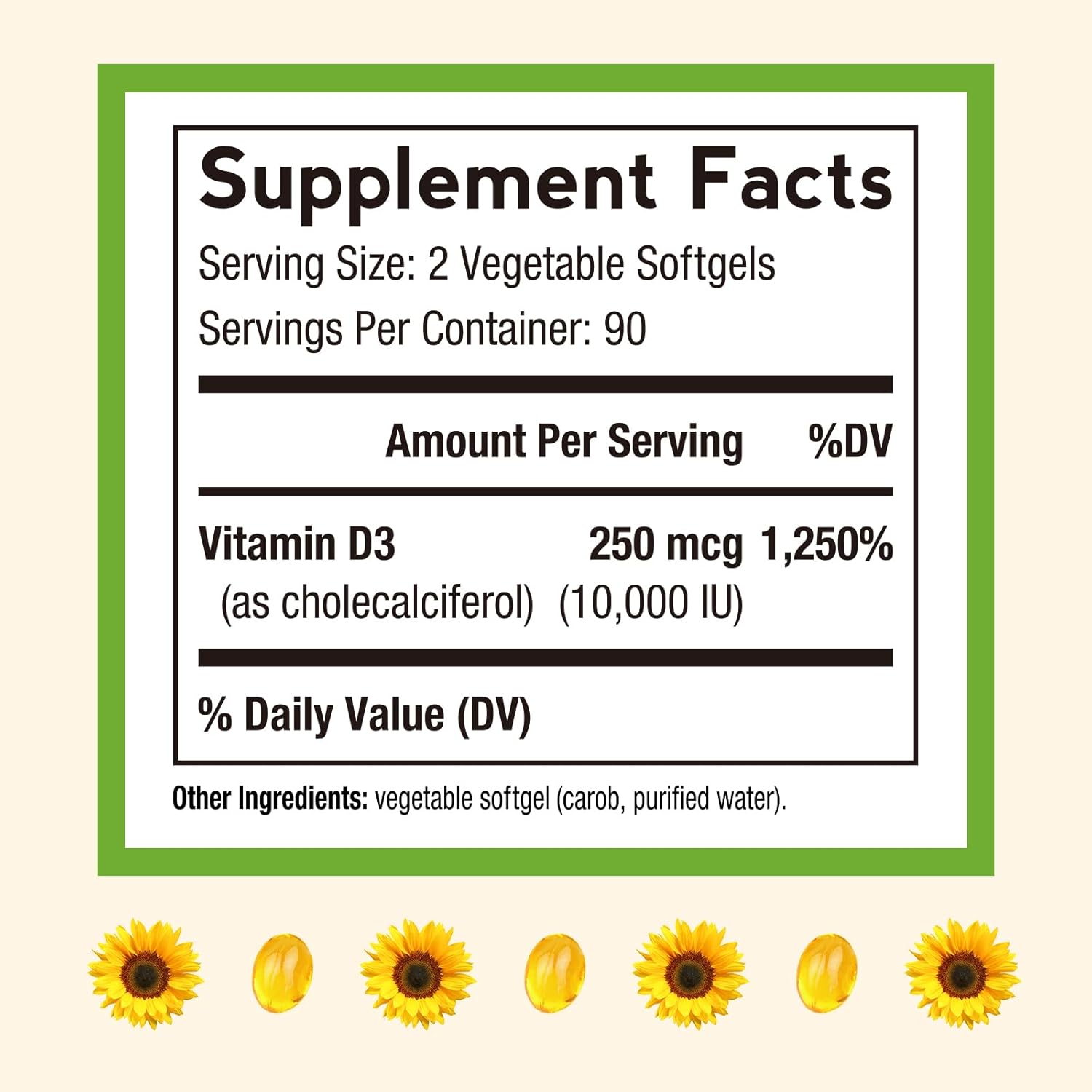 Sunshine in a Bottle: Did you know that approximately 75% of Americans are deficient in vitamin D3 Whether itâs long winter months, rainy days, or simply limited access to sunlight, we all need a nice blast of Vitamin D. In one easy to take, vegetable softgel, Doctorâs Recipes delivers 10000 IU of this essential vitamin as D3 - the same form your body naturally produces from sunlight - to help replicate the benefits of natural sunlight with minimum UVB exposure