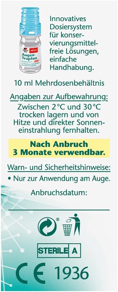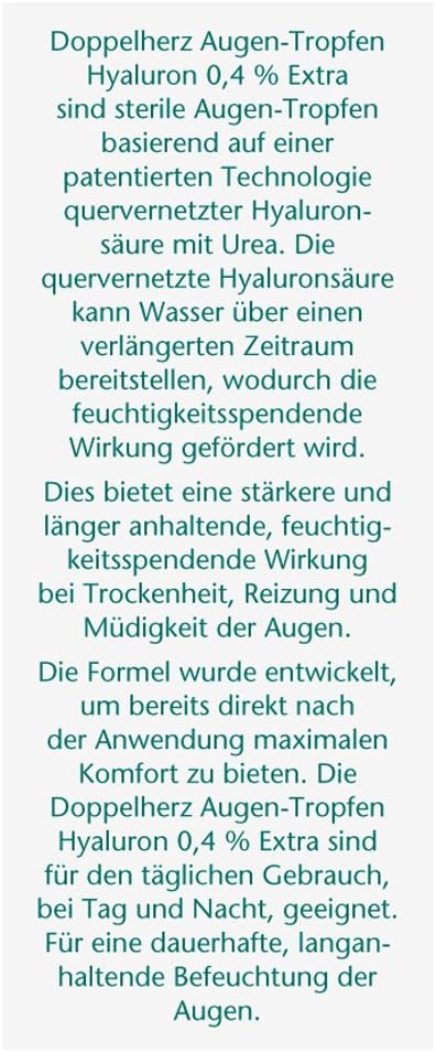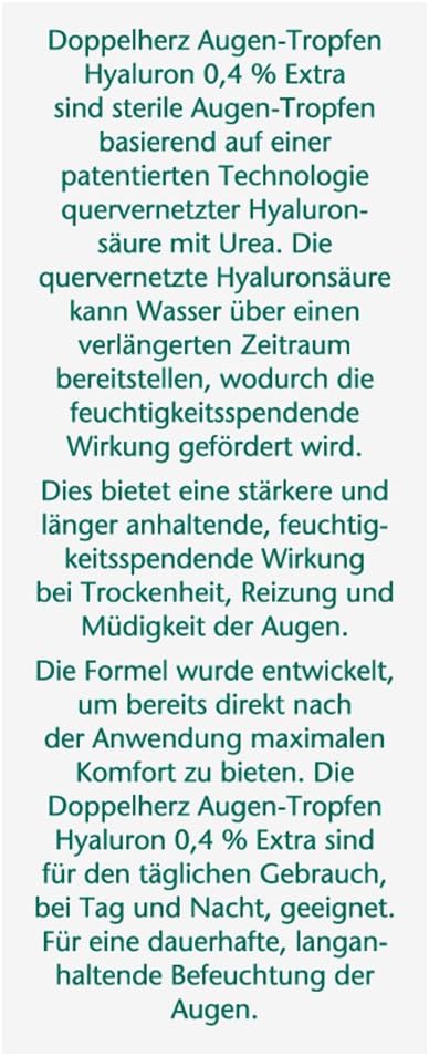 About this item The eye drops from Doppelherz ensure long-lasting moisturisation of the eyes and can relieve redness, fatigue and irritation of the eyes, even for contact lens wearers. Thanks to patented technology of cross-linked hyaluronic acid with urea, the drops provide water for a longer period of time and moisturise dry and irritated eyes. The moisture drops provide maximum comfort immediately after application and soothe the unpleasant dryness or foreign body sensation. Thanks to the absence of preservatives, the Doppelherz eye drops are particularly well tolerated and can also be used several times during day and night over a longer period of time. Box contents: 1 x 10 ml Doppelherz Eye Drops Extra Hyaluron 0.4% in practical, resealable bottles with single dosing system for relaxed and complaint-free eyes. › See more product details,The eye drops from Doppelherz ensure long-lasting moisturisation of the eyes and can relieve redness, fatigue and irritation of the eyes, even for contact lens wearers,Thanks to patented technology of cross-linked hyaluronic acid with urea, the drops provide water for a longer period of time and moisturise dry and irritated eyes,The moisture drops provide maximum comfort immediately after application and soothe the unpleasant dryness or foreign body sensation,Thanks to the absence of preservatives, the Doppelherz eye drops are particularly well tolerated and can also be used several times during day and night over a longer period of time,Box contents: 1 x 10 ml Doppelherz Eye Drops Extra Hyaluron 0.4% in practical, resealable bottles with single dosing system for relaxed and complaint-free eyes