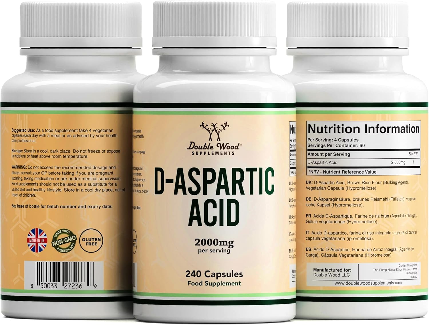 Double Wood D Aspartic Acid Supplement | 240 (60 Servings) D-Aspartic Testosterone Capsules | 2000Mg D Aspartic Acid (Daa) Per Serving | Non-Gmo, Gluten & Dairy Free