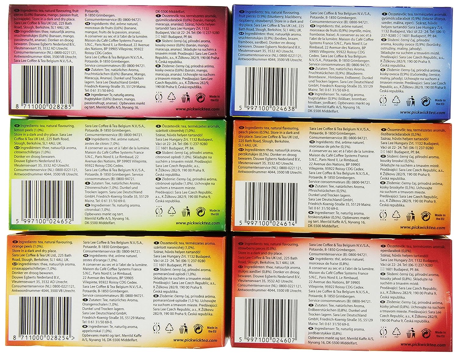 The combipack includes one pack of each: Pickwick Strawberry Tea * Pickwick Orange Tea * Pickwick Forest Fruit Tea * Pickwick Lemon Tea * Pickwick Tropical Tea * Pickwick Peach Tea. Each package contains 20 individually wrapped tea bags