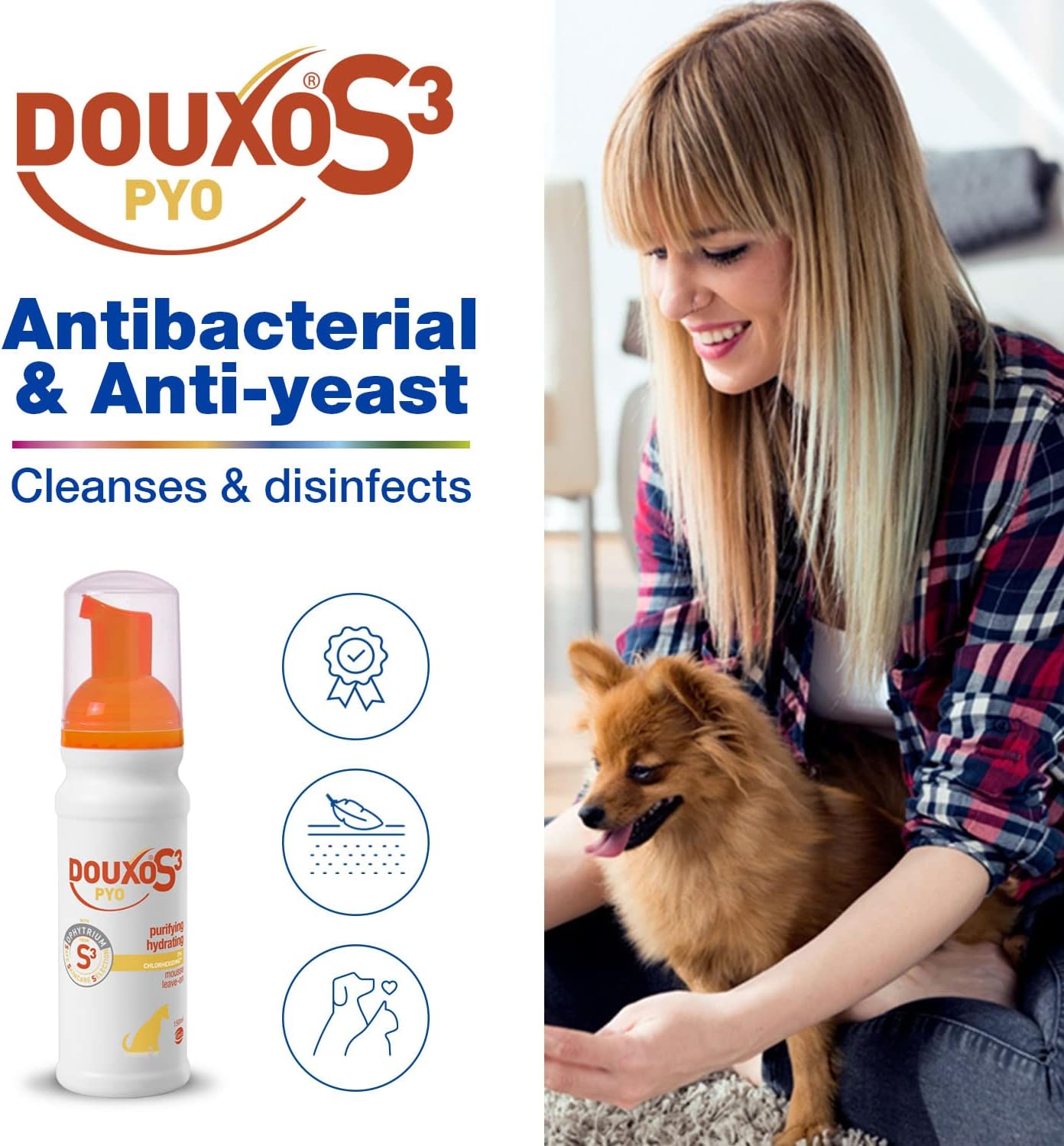 Douxo S3 Pyo Mousse, Waterless Antibacterial & Anti-Yeast Mousse, Leave-On Douxo S3-Pyo Mousse, Chlorhexidine For Dogs, No Rinse No Bath Mousse For Dogs, Hypoallergenic Fragrance, 150Ml