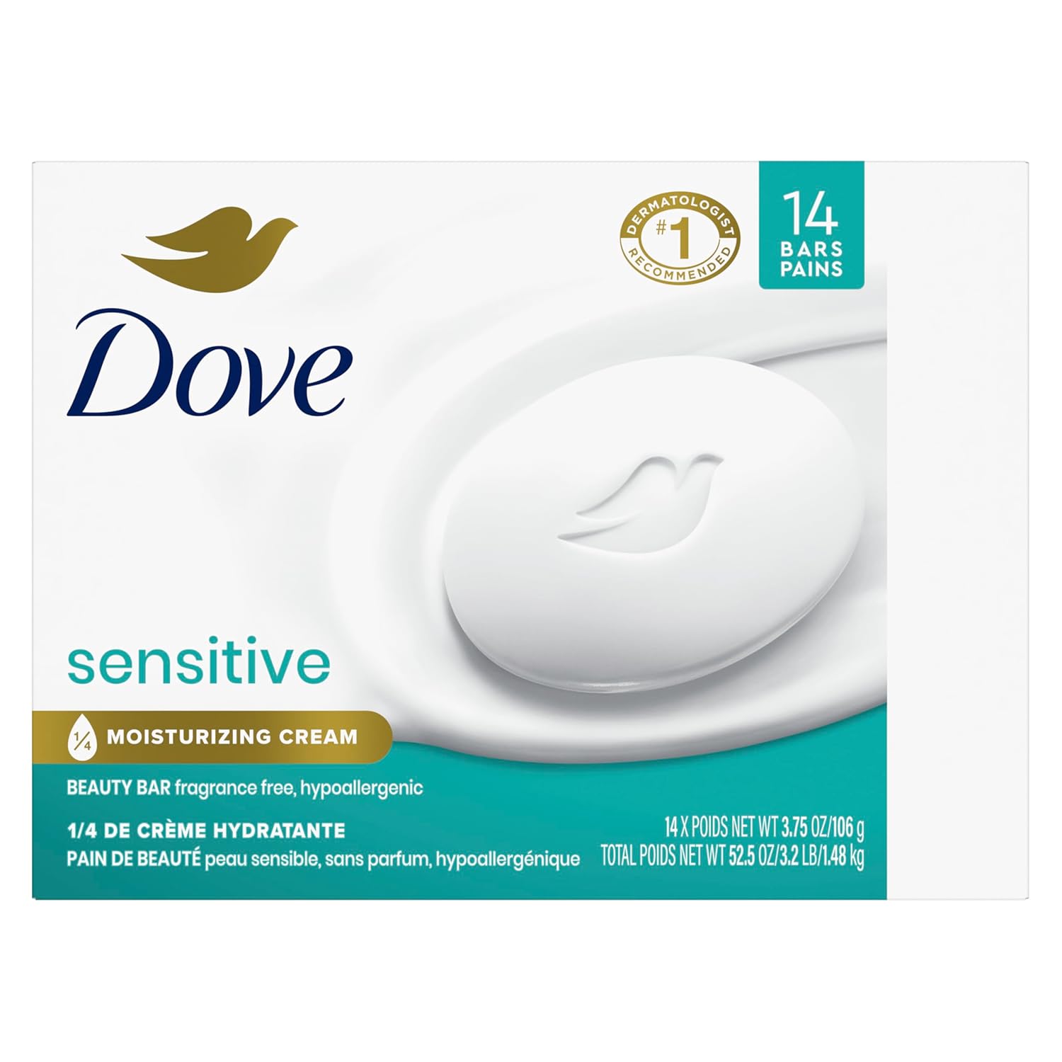About this item GENTLE ON SENSITIVE SKIN: Effectively wash away bacteria and nourish your skin with Dove Sensitive Skin Beauty Bar With its unscented and hypoallergenic formula, it gently cleanses for softer skin than ordinary bar soap MILD AND MOISTURIZING: Help maintain your skinâs natural moisture barrier and hydration with this beauty bar for womenâideal to use as a gentle face cleanser and body soap for sensitive skin. #1 DERMATOLOGIST RECOMMENDED: Formulated with mild cleansers and ÂŒ moisturizing cream, Dove moisturizing Beauty Bar helps give you instantly soft skin and lasting nourishment. GENTLE CLEANSING Lather in the luxurious feel of this beauty bar that wonât dry skin like other soap can. Gentle enough to use every day as on both your body and your face. A FRESH ALTERNATIVE: Fans of shea butter soap and lavender soap might want to try this beauty bar with gentle cleansers to help replenish nutrients, leaving dry skin feeling soft and smooth. âș See more product details,GENTLE ON SENSITIVE SKIN: Effectively wash away bacteria and nourish your skin with Dove Sensitive Skin Beauty Bar With its unscented and hypoallergenic formula, it gently cleanses for softer skin than ordinary bar soap,MILD AND MOISTURIZING: Help maintain your skinâs natural moisture barrier and hydration with this beauty bar for womenâideal to use as a gentle face cleanser and body soap for sensitive skin,#1 DERMATOLOGIST RECOMMENDED: Formulated with mild cleansers and ÂŒ moisturizing cream, Dove moisturizing Beauty Bar helps give you instantly soft skin and lasting nourishment,GENTLE CLEANSING Lather in the luxurious feel of this beauty bar that wonât dry skin like other soap can. Gentle enough to use every day as on both your body and your face,A FRESH ALTERNATIVE: Fans of shea butter soap and lavender soap might want to try this beauty bar with gentle cleansers to help replenish nutrients, leaving dry skin feeling soft and smooth