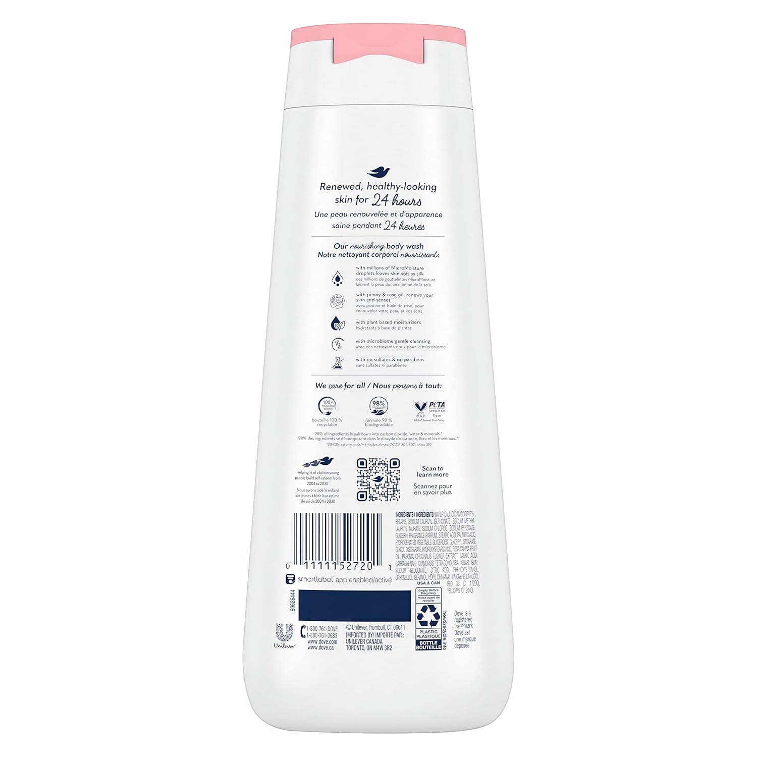 About this item 24HR RENEWING MICROMOISTURE: Dove Renewing Peony and Rose Oil Body Wash gently cleanses and nourishes the skin, leaving it renewed and healthy-looking for 24 hours FOR SOFT, SMOOTH SKIN: Our nourishing body wash, formulated with millions of MicroMoisture droplets, leaves skin soft as silk WITH PEONY & ROSE OIL: This gentle skin cleanser, infused with peony and rose oil, renews your skin and senses HOW TO USE: Squeeze a generous amount of Dove Renewing Body Wash into your palms. Massage the body wash onto your skin, taking a moment to enjoy the rich lather before rinsing off DERMATOLOGIST-RECOMMENDED BODY WASH BRAND: From the dermatologist-recommended body wash brand, this body wash, made with plant-based moisturizers, gently cleanses your skin and nourishes its microbiome › See more product details,24HR RENEWING MICROMOISTURE: Dove Renewing Peony and Rose Oil Body Wash gently cleanses and nourishes the skin, leaving it renewed and healthy-looking for 24 hours,FOR SOFT, SMOOTH SKIN: Our nourishing body wash, formulated with millions of MicroMoisture droplets, leaves skin soft as silk,WITH PEONY & ROSE OIL: This gentle skin cleanser, infused with peony and rose oil, renews your skin and senses,HOW TO USE: Squeeze a generous amount of Dove Renewing Body Wash into your palms. Massage the body wash onto your skin, taking a moment to enjoy the rich lather before rinsing off,DERMATOLOGIST-RECOMMENDED BODY WASH BRAND: From the dermatologist-recommended body wash brand, this body wash, made with plant-based moisturizers, gently cleanses your skin and nourishes its microbiome
