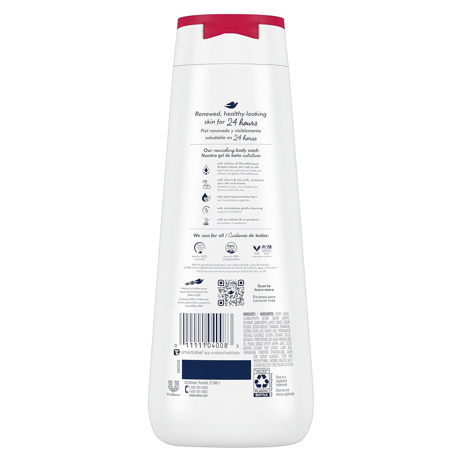 About this item 24HR RENEWING MICROMOISTURE: Dove Revitalizante Body Wash gently cleanses and hydrates the skin, leaving it renewed and healthy-looking for 24 hours FOR SOFT, SMOOTH SKIN: Our nourishing body wash, formulated with millions of MicroMoisture droplets, leaves skin soft as silk WITH CHERRY & CHIA MILK: This gentle skin cleanser, infused with cherry and chia milk, revitalizes your skin and senses HOW TO USE: Squeeze a generous amount of Dove Revitalizante Body Wash into your palms; Massage the hydrating body wash onto your skin, taking a moment to enjoy the rich lather before rinsing off #1 DERMATOLOGIST-RECOMMENDED BODY WASH BRAND: From the #1 dermatologist-recommended body wash brand, this body wash, made with plant-based moisturizers, gently cleanses your skin and nourishes its microbiome › See more product details,24HR RENEWING MICROMOISTURE: Dove Revitalizante Body Wash gently cleanses and hydrates the skin, leaving it renewed and healthy-looking for 24 hours,FOR SOFT, SMOOTH SKIN: Our nourishing body wash, formulated with millions of MicroMoisture droplets, leaves skin soft as silk,WITH CHERRY & CHIA MILK: This gentle skin cleanser, infused with cherry and chia milk, revitalizes your skin and senses,HOW TO USE: Squeeze a generous amount of Dove Revitalizante Body Wash into your palms; Massage the hydrating body wash onto your skin, taking a moment to enjoy the rich lather before rinsing off,#1 DERMATOLOGIST-RECOMMENDED BODY WASH BRAND: From the #1 dermatologist-recommended body wash brand, this body wash, made with plant-based moisturizers, gently cleanses your skin and nourishes its microbiome