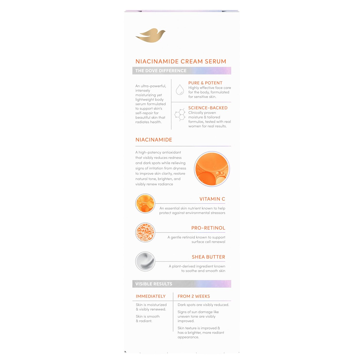 Dove Niacinamide + Even Tone Cream Serum Is A Non-Greasy, Fast-Absorbing, Lightweight, All-Over Body Serum That Delivers Next-Level Skin Care That Goes Beyond Moisturization. This High-Potency Body Serum Is Made With Face Care Ingredients And Supports Skin'S Natural Regenerative Process For Visible Results: Reduces Dark Spots, Minimizes Signs Of Sun Damage Like Uneven Tone, And Improves Skin Texture For Brighter, Smoother, More Radiant Skin. Dove Niacinamide + Even Tone Cream Serum Is A Non-Greasy, Fast-Absorbing, Lightweight, All-Over Body Serum That Delivers Next-Level Skin Care That Goes Beyond Moisturization. This High-Potency Body Serum Is Made With Face Care Ingredients And Supports Skin'S Natural Regenerative Process For Visible Results: Reduces Dark Spots, Minimizes Signs Of Sun Damage Like Uneven Tone, And Improves Skin Texture For Brighter, Smoother, More Radiant Skin. Dove Cream Serums Are Clinically Tested With Over 1,000 Women To Ensure Safety And Efficacy Across All Skin Types. This Formula Is Designed For All-Over, Daily Use In Place Of Body Lotion And Has A Velvety Application Tested And Loved By Real Women. Other Skin Needs Or Concerns Explore Our Full Range Of Dove Cream Serum Dermocosmetic Solutions - All Developed With Dermatologists, Designed For All Skin Types And Tones, Suitable For Sensitive Skin, And Proven For Visible Results