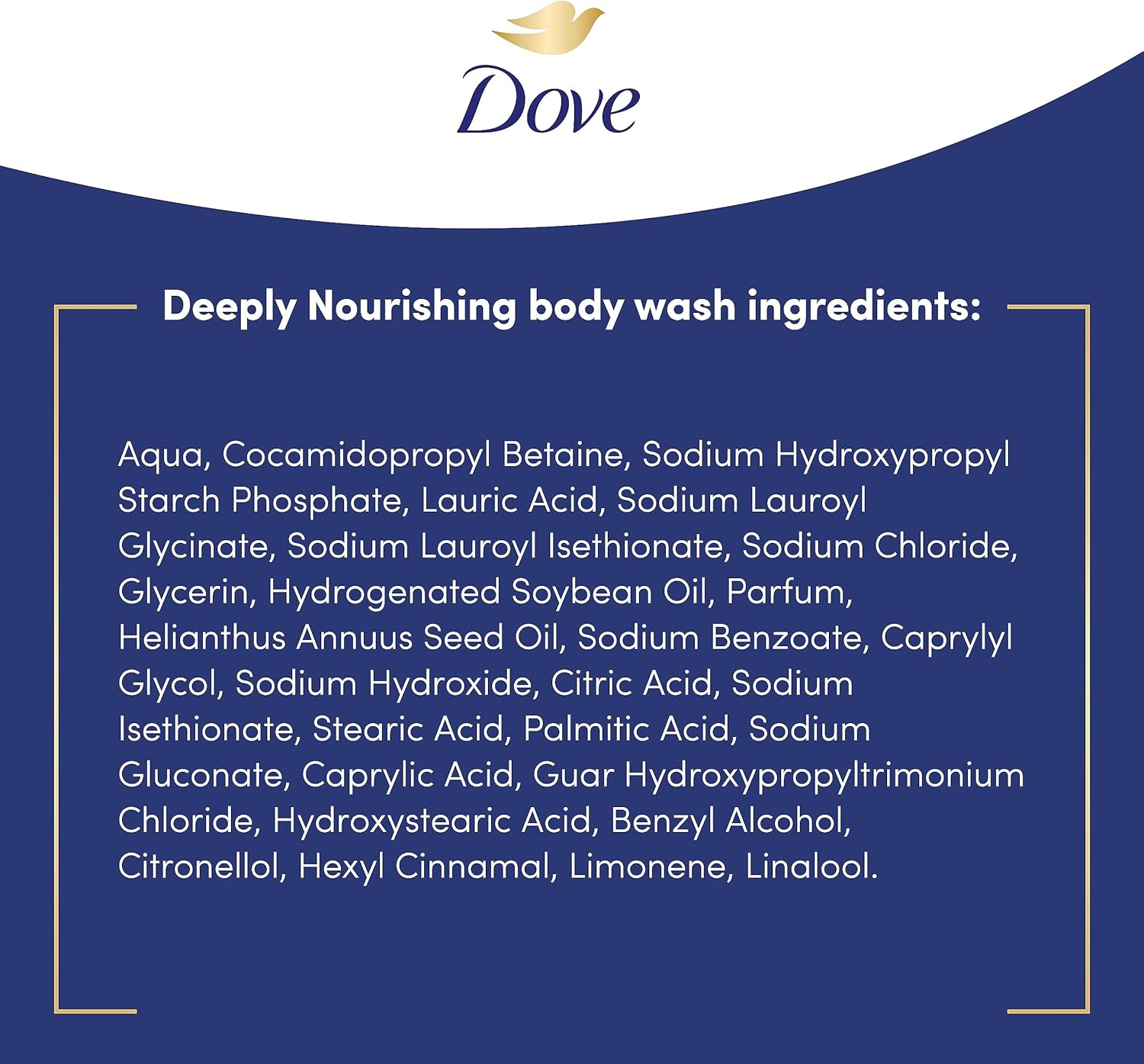 Product Description Just as we all have different skin, skin dryness can show up differently for everyone. From mild, occasionally dry skin driven by ageing or weather fluctuations to dry patches galore – no matter how dry your skin may look or feel, Dove Deeply Nourishing Body Wash has got you covered. Specially formulated to transform even the driest skin in just one shower, this gentle shower gel contains naturally derived cleansers, plant-based moisturisers and 3 skin conditioners – a unique blend of prebiotics to nourish your skin and its microbiome, your skin’s living protective layer. Dermatologically tested and PETA-Approved Vegan, our moisturising body cleanser features a 97% bio-degradable** sulphate-SLES-free formula that replenishes your skin from within* and helps retain its natural moisture rather than stripping it away. It not only makes your skin feel instantly softer and smoother but also delivers long-lasting nourishment. For best results, squeeze this moisturising body wash generously between your palms or onto a shower puff, work into a creamy lather and massage all over your body, allowing the light lather to soothe and cleanse your skin before rinsing thoroughly. *within the stratum corneum **97% of ingredients break down into carbon dioxide, water and minerals (OECD test methods 301, 302 or 310) Ingredients Aqua, Cocamidopropyl Betaine, Sodium Hydroxypropyl Starch Phosphate, Lauric Acid, Sodium Lauroyl Glycinate, Sodium Lauroyl Isethionate, Sodium Chloride, Glycerin, Hydrogenated Soybean Oil, Parfum, Helianthus Annuus Seed Oil, Sodium Benzoate, Sodium Hydroxide, Citric Acid, Stearic Acid, Guar Hydroxypropyltrimonium Chloride, Undecylenoyl Glycine, Capryloyl Glycine, Sodium Isethionate, Palmitic Acid, Tetrasodium EDTA, Caprylic Acid, Capric Acid, Hydroxystearic Acid, Benzyl Alcohol, Citronellol, Hexyl Cinnamal, Limonene, Linalool. P.when('A').execute(function(A) { A.on('a:expander:toggle_description:toggle:collapse', function(data) { window.scroll(0, data.expander.$expander[0].offsetTop-100); }); }); Safety Warning N/Anot applicable Manufacturer Contact Information Unilever Dept ER, Wirral CH63 3JW UK See more,Dove Deeply Nourishing Body wash transforms even the driest skin in just one shower,Infused with 3 unique skin conditioners, this moisturising shower gel doesn’t strip moisture from the skin but instead replenishes it from within,Our hydrating body wash nourishes deep into the surface layers of your skin,The gentle, 97% bio-degradable** shower gel formula protects your microbiome (your skin’s protective layer),This dermatologically tested body cleanser is made with plant-based moisturisers to leave your skin soft, smooth and cared for,Discover Dove’s gentlest ever SLES-free body wash, packaged in a 100% recycled plastic bottle (excluding cap and label)