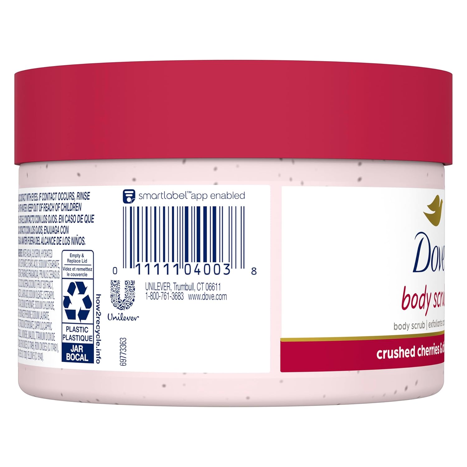 About this item REVITALIZES SKIN: Dove Exfoliating Body Polish with Crushed Cherries & Chia Milk provides lasting nourishment, cleans and polishes to reveal revitalized skin. 1/4 MOISTURIZING CREAM: This gentle pH balanced exfoliating body polish is formulated with 1/4 moisturizing cream to leave your skin soft and smooth, providing complete skin care. WITH CRUSHED CHERRIES & CHIA MILK: This exfoliating body polish is infused with crushed cherries and chia milk and revitalizes your skin and senses. HOW TO USE: Scoop a generous amount of Dove Body Polish into your palms. Massage onto wet skin and rinse clean. Enjoy 3-4 times per week. RAISING YOUR SELF-ESTEEM: At Dove, we are on a mission to help over 1/4 of a billion young people build self-esteem from 2004 to 2030 with our bath and body products. › See more product details,REVITALIZES SKIN: Dove Exfoliating Body Polish with Crushed Cherries & Chia Milk provides lasting nourishment, cleans and polishes to reveal revitalized skin,1/4 MOISTURIZING CREAM: This gentle pH balanced exfoliating body polish is formulated with 1/4 moisturizing cream to leave your skin soft and smooth, providing complete skin care,WITH CRUSHED CHERRIES & CHIA MILK: This exfoliating body polish is infused with crushed cherries and chia milk and revitalizes your skin and senses,HOW TO USE: Scoop a generous amount of Dove Body Polish into your palms. Massage onto wet skin and rinse clean. Enjoy 3-4 times per week,RAISING YOUR SELF-ESTEEM: At Dove, we are on a mission to help over 1/4 of a billion young people build self-esteem from 2004 to 2030 with our bath and body products