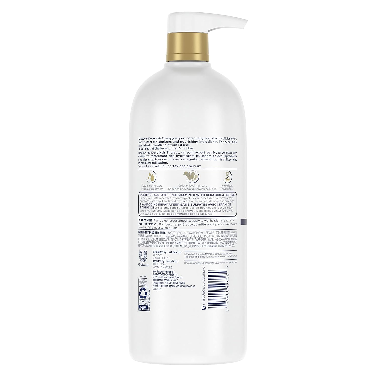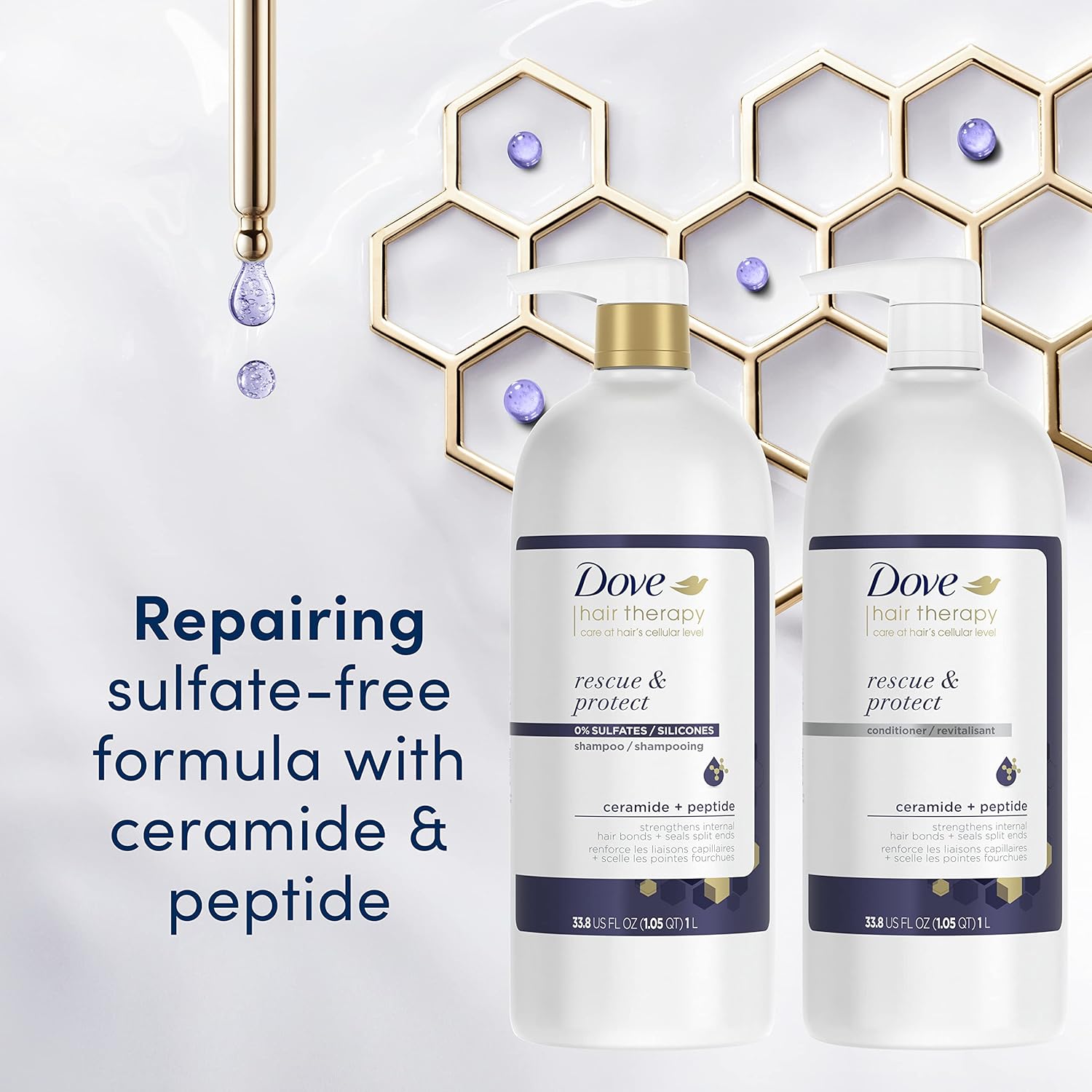 Brushing, styling, heat, pollution – your hair goes through a lot. Dove Hair Therapy Rescue and Protect Shampoo gives your hair a little extra TLC that it deserves. Formulated with ceramides and peptides, this hair care shampoo is perfect for over-processed or damaged hair that's prone to breakage and split ends. This sulfate free shampoo is designed as a hair treatment to strengthen internal hair bonds, seal split ends, and protect hair from heat damage and breakage. The Dove Hair Therapy range features potent moisturizers and nourishing ingredients that go to the hair's cellular level and leave hair feeling beautifully cleansed, smooth and healthy. Nourishes at the level of hair's cortex. How to use: Pump a generous amount of the shampoo, apply to wet hair, lather and rinse. After washing your hair with shampoo, apply our Dove Hair Therapy Rescue and Protect Conditioner + Serum to visibly repair hair damage, gently condition and seal split ends in just 1 minute! Want 2X visibly fuller and thicker hair Try our Dove Hair Therapy Strength and Fullness Shampoo and Conditioner. For hair with that envious shine, try Dove Hair Therapy Glow and Restore Shampoo and Conditioner. Unilever’s ongoing work on alternatives to animal testing for more than 30 years, and its commitment to promote their adoption globally, has been recognized by PETA, which has listed Unilever as “a company working for regulatory change.” Globally, Dove does not test on animals and is certified by PETA as Cruelty-Free,Dove Hair Therapy Rescue and Protect Shampoo strengthens internal hair bonds, seals split ends and protects hair from heat damage and breakage,Dove Hair Therapy Rescue and Protect Shampoo is perfect for over-processed or damaged hair and for hair that's prone to split ends,This sulfate free shampoo is formulated with ceramides, peptides and nourishing ingredients that strengthen and repair hair from the cellular level,Nourishing hair care shampoo that gives you beautifully soft, smooth and healthy-looking hair from the first use,Pump a generous amount of Dove Hair Therapy Rescue and Protect Shampoo, apply to wet hair, lather and rinse for stronger, healthier, beautiful hair,Pair this shampoo with our Dove Hair Therapy Rescue and Protect Conditioner + Serum to seal split ends and protect hair in just 1 minute
