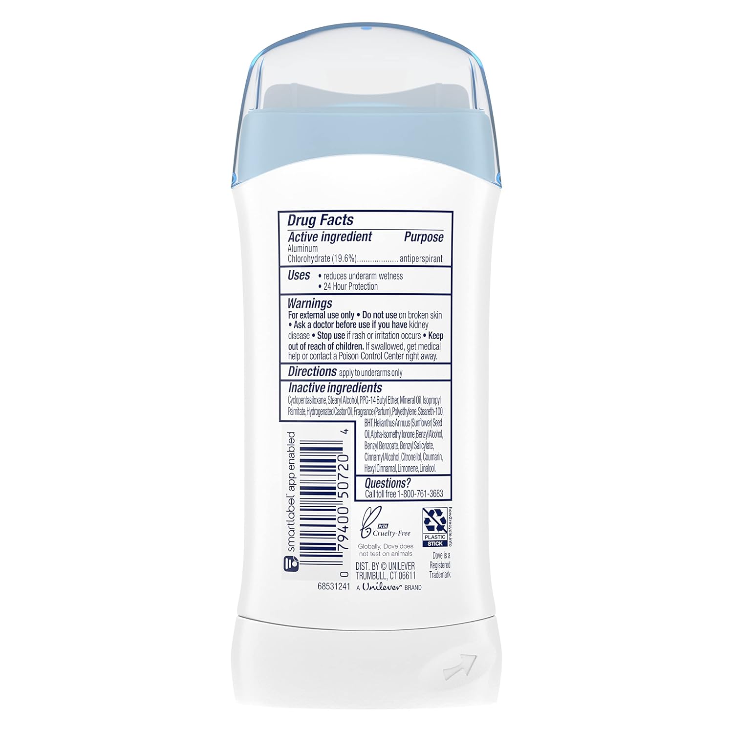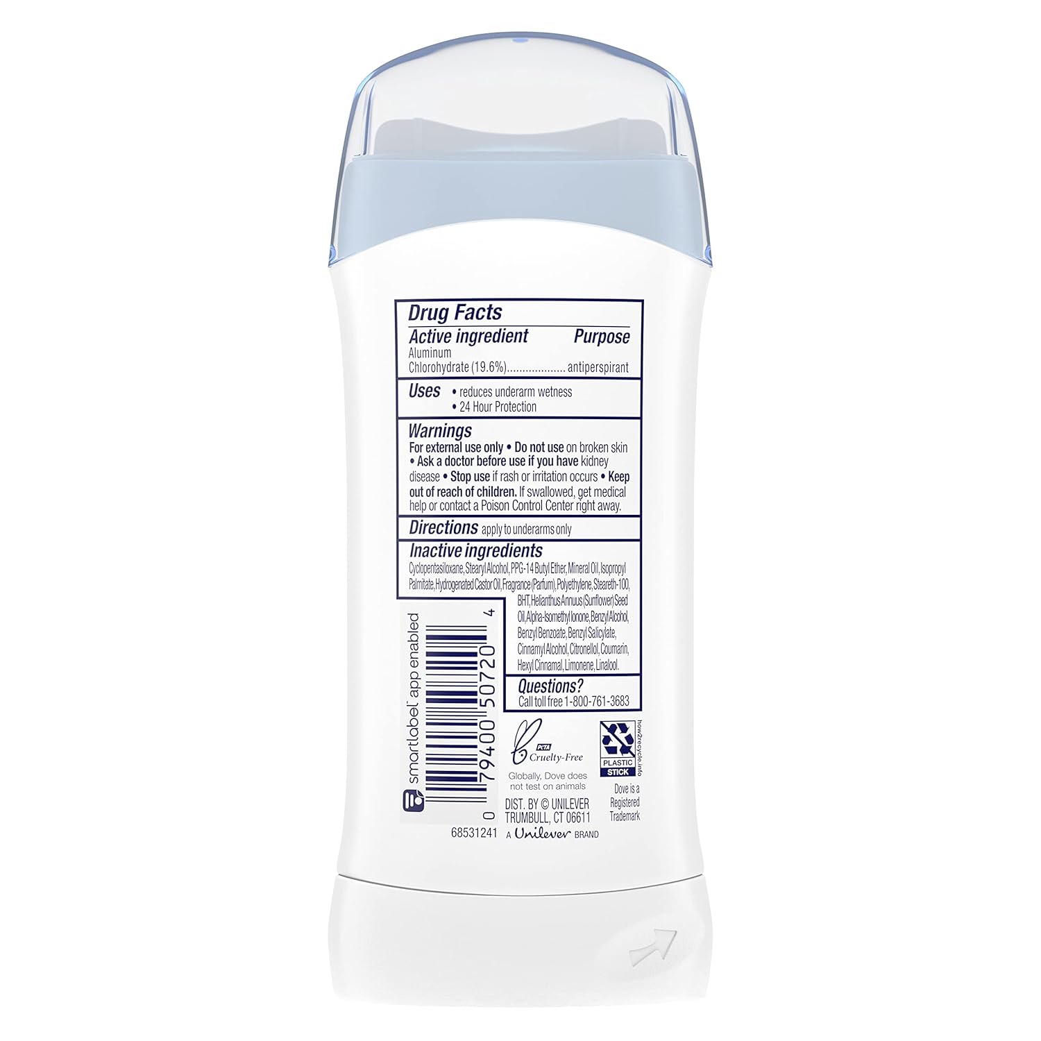 About this item Dove Invisible Solid Powder Antiperspirant Deodorant Stick provides all day underarm sweat & odor protection Our antiperspirant deodorant for women, containing 1/4 moisturizers, cares for your underarm skin The 0% alcohol (ethanol) formula of our antiperspirant stick helps skin recover from underarm irritation that shaving can cause This women's deodorant stick provides a classic, warm, powdery scent to indulge your senses throughout the day Antiperspirant deodorant stick glides on for easy application Globally, Dove does not test on animals, so all of our antiperspirant deodorants are cruelty free and certified by PETA › See more product details,Dove Invisible Solid Powder Antiperspirant Deodorant Stick provides all day underarm sweat & odor protection,Our antiperspirant deodorant for women, containing 1/4 moisturizers, cares for your underarm skin,The 0% alcohol (ethanol) formula of our antiperspirant stick helps skin recover from underarm irritation that shaving can cause,This women's deodorant stick provides a classic, warm, powdery scent to indulge your senses throughout the day,Antiperspirant deodorant stick glides on for easy application,Globally, Dove does not test on animals, so all of our antiperspirant deodorants are cruelty free and certified by PETA