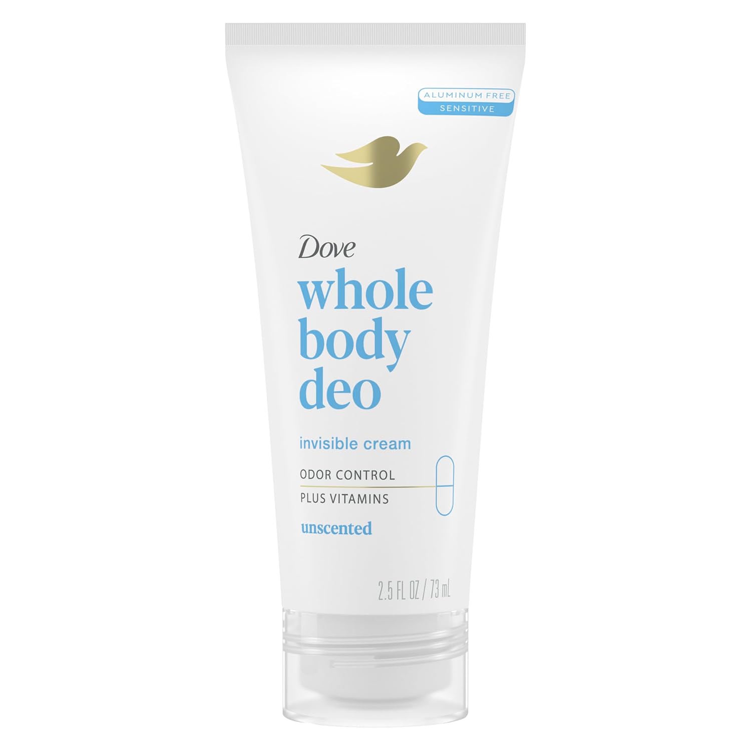Dove Whole Body Deo Aluminum Free Invisible Cream Deodorant Unscented For 72H Odor Control, 2.5 Oz