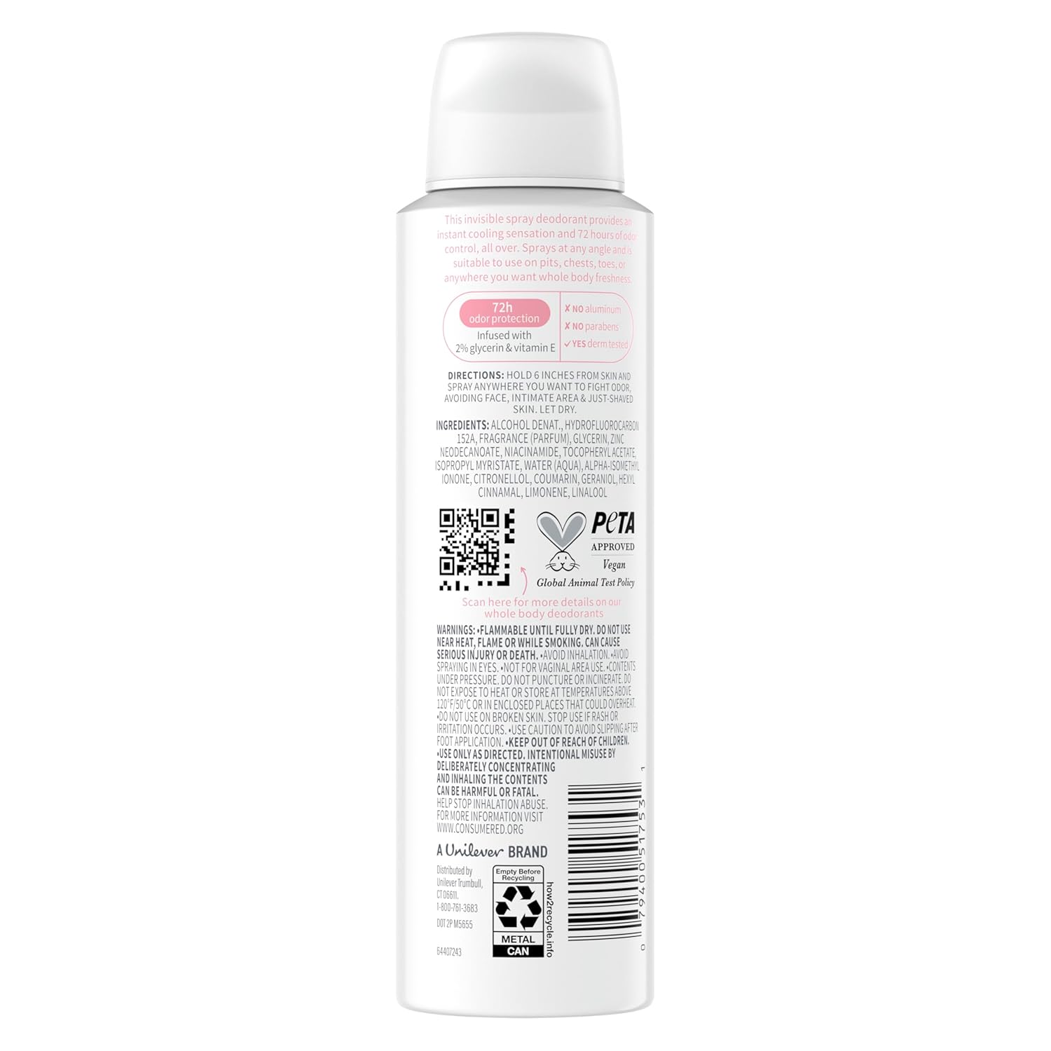 About this item 72H ODOR CONTROL: It’s time to experience a new level of freshness, thanks to our cooling whole body deodorant spray. It dries instantly and tackles odor for 72 hours to keep you feeling confident. DESIGNED FOR YOUR WHOLE BODY: This invisible spray can be applied anywhere you want a freshen-up – from your chest and thighs to your feet and back. SKIN CARE INFUSED: If you’re looking for gentle skin care, this body spray is infused with a skin-loving blend of 2% glycerin & vitamin E to nourish your skin while tackling odor DERM-TESTED: This dermatologist-tested deodorant is also free from aluminum and parabens. Win-win. SOOTHING FRAGRANCE: Looking for a body spray that keeps you feeling zen throughout the day Allow the soothing sage and lavender scent in this Dove deodorant spray to calm and ground your senses, morning, noon and night. CARE YOU CAN COUNT ON: Globally, Dove does not test on animals, and this whole body deodorant spray is PETA-Approved Vegan and free from aluminum and parabens › See more product details,72H ODOR CONTROL: It’s time to experience a new level of freshness, thanks to our cooling whole body deodorant spray. It dries instantly and tackles odor for 72 hours to keep you feeling confident,DESIGNED FOR YOUR WHOLE BODY: This invisible spray can be applied anywhere you want a freshen-up – from your chest and thighs to your feet and back,SKIN CARE INFUSED: If you’re looking for gentle skin care, this body spray is infused with a skin-loving blend of 2% glycerin & vitamin E to nourish your skin while tackling odor,DERM-TESTED: This dermatologist-tested deodorant is also free from aluminum and parabens. Win-win,SOOTHING FRAGRANCE: Looking for a body spray that keeps you feeling zen throughout the day Allow the soothing sage and lavender scent in this Dove deodorant spray to calm and ground your senses, morning, noon and night,CARE YOU CAN COUNT ON: Globally, Dove does not test on animals, and this whole body deodorant spray is PETA-Approved Vegan and free from aluminum and parabens