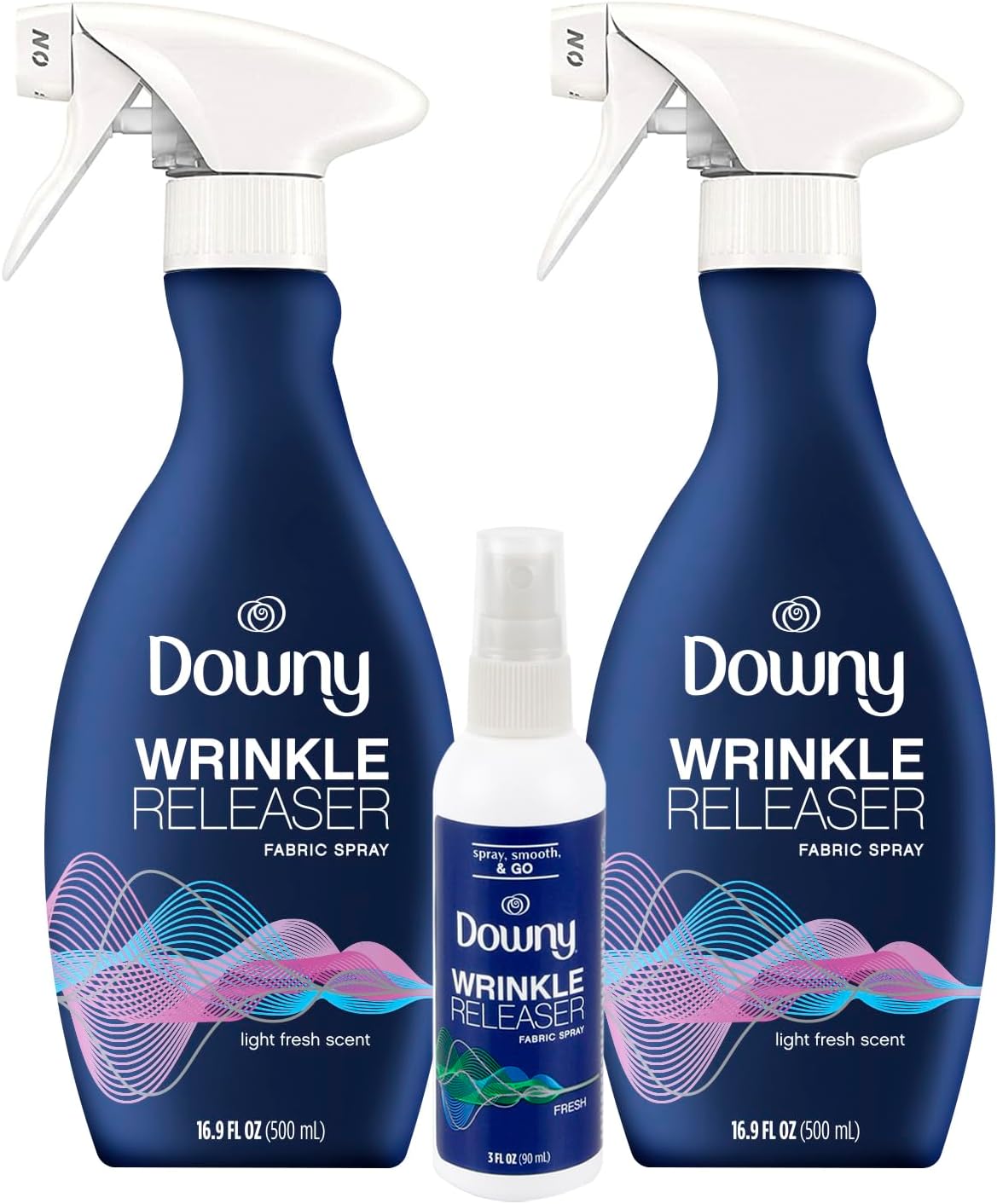 You will receive two 16.9 fl oz + one 3 fl oz bottles of Downy Wrinkle Releaser All-in-One Spray: Wrinkle Remover, Static Remover, Odor Eliminator, Fabric Refresher, and Ironing Aid10To use: simply spray fabric, tug and smooth away wrinkles, hang dry10Great for college students, business travelers, and last minute touch ups: removes static so you can keep wearing your favorite outfits without hesitation!10Works as an ironing aid, or on it's own: try it on curtains, tablecloths, sheets, pillow cases and more10Adds a light scent to eliminate odors and keep fabrics smelling fresh