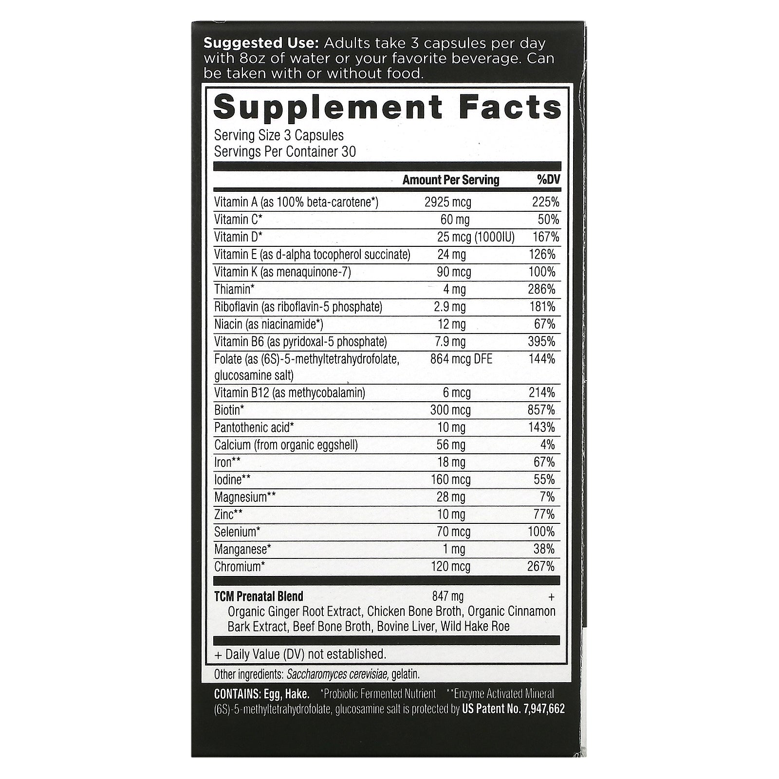 - An array of vitamins and minerals designed for prenatal needs, including a patented form of methylated Folate, fermented and co-enzymated B vitamins, enzyme-activated Iron, probiotic-fermented Vitamin C, Soy-Free Vitamin K2 (MK-7)