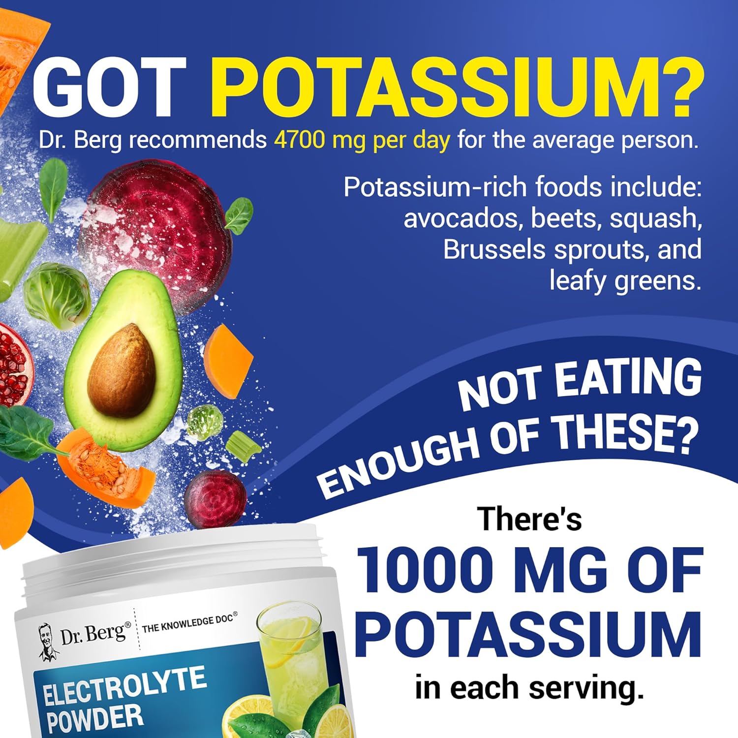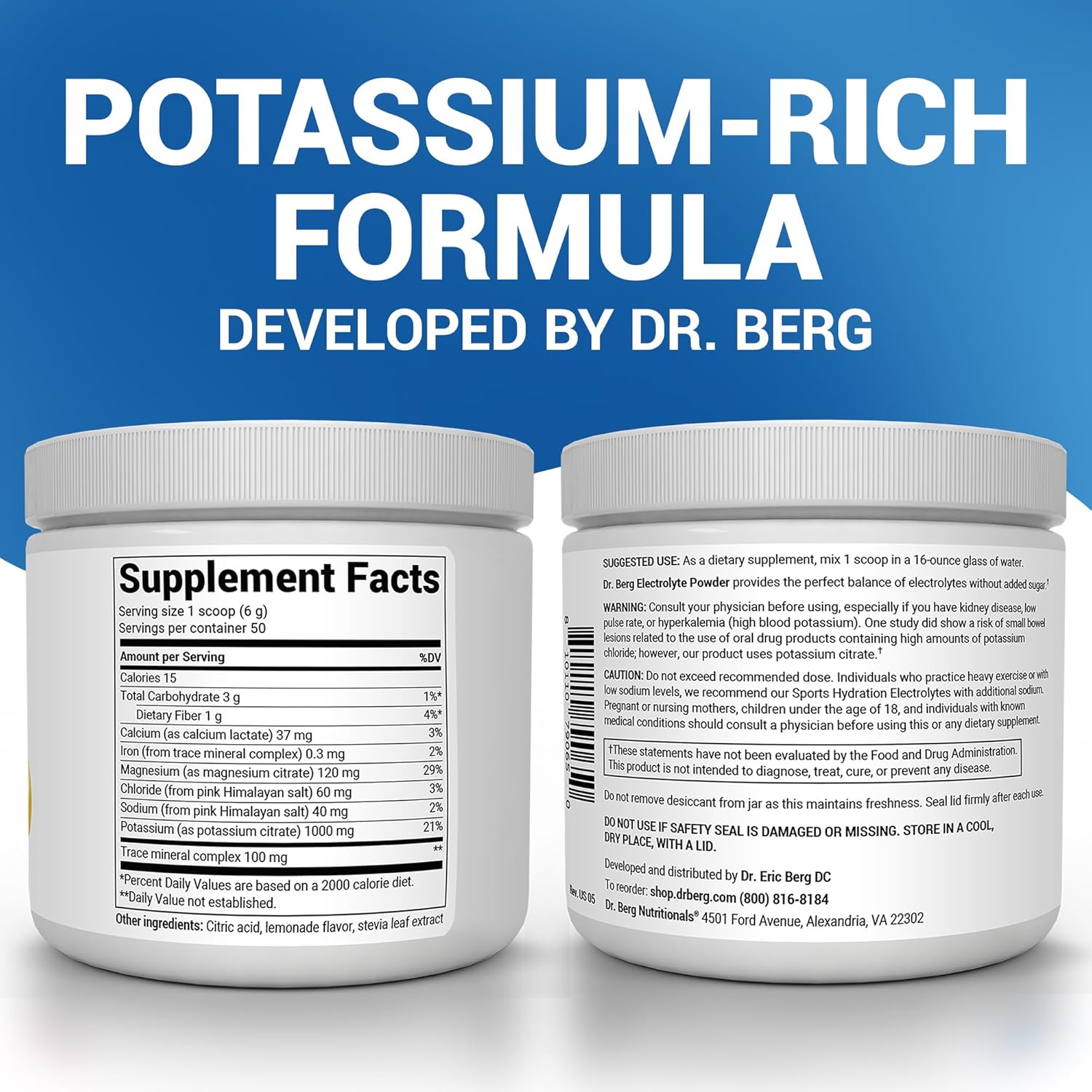 About this item - Each serving is loaded with 1,000 mg of potassium as opposed to only 250 mg other brands offer. Additionally, this electrolytes powder offers a very unique blend of Calcium, Magnesium, Chloride (from Pink Himalayan Salt - NOT table salt other brands offer) and an amazing Trace Mineral Complex. This refreshing and delicious Lemonade flavor includes 50 servings. - Add one scoop to 16 oz of water. Shake or stir well. Allow 5â10 minutes for full dissolution, as no dissolving agents are used. - We're sorry to say it, but if youâre looking for cheap, youâre in the wrong place. We search far and wide, domestic and international, to provide high-quality ingredients for which your body will thank you. Unfortunately, getting the best ingredients from domestic and international farms can come at a higher-than-normal cost. If quality, satisfaction, and results are essential to you, youâre in the right place! â - Also known as The Knowledge Doc, Dr. Berg has spent most of his life researching and providing natural solutions to everyday health problems. This extensive research and thousands of hours working with patients are what sets us apart from other brands, as it has allowed us to create proprietary blends you canât get anywhere else. - - If for any reason you're not happy with the results you experience within the first 30 days, we're happy to give you a full refund! Send us a message, and the refund will be processed as long as it's requested within 30 days of purchase. See more product details, - Each serving is loaded with 1,000 mg of potassium as opposed to only 250 mg other brands offer. Additionally, this electrolytes powder offers a very unique blend of Calcium, Magnesium, Chloride (from Pink Himalayan Salt - NOT table salt other brands offer) and an amazing Trace Mineral Complex. This refreshing and delicious Lemonade flavor includes 50 servings, - Add one scoop to 16 oz of water. Shake or stir well. Allow 5â10 minutes for full dissolution, as no dissolving agents are used, - We're sorry to say it, but if youâre looking for cheap, youâre in the wrong place. We search far and wide, domestic and international, to provide high-quality ingredients for which your body will thank you. Unfortunately, getting the best ingredients from domestic and international farms can come at a higher-than-normal cost. If quality, satisfaction, and results are essential to you, youâre in the right place!, â - Also known as The Knowledge Doc, Dr. Berg has spent most of his life researching and providing natural solutions to everyday health problems. This extensive research and thousands of hours working with patients are what sets us apart from other brands, as it has allowed us to create proprietary blends you canât get anywhere else,- - If for any reason you're not happy with the results you experience within the first 30 days, we're happy to give you a full refund! Send us a message, and the refund will be processed as long as it's requested within 30 days of purchase