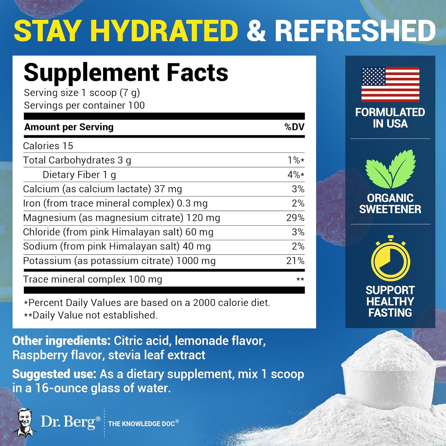 About this item - Each serving is loaded with 1,000 mg of potassium as opposed to only 250 mg other brands offer. Additionally, this electrolytes powder offers a very unique blend of Calcium, Magnesium, Chloride (from Pink Himalayan Salt - NOT table salt other brands offer) and an amazing Trace Mineral Complex. This refreshing and delicious Raspberry and Lemon flavor includes 100 servings. - Add one scoop to 16 oz of water. Shake or stir well. Allow 5–10 minutes for full dissolution, as no dissolving agents are used. - We're sorry to say it, but if you’re looking for cheap, you’re in the wrong place. We search far and wide, domestic and international, to provide high-quality ingredients for which your body will thank you. Unfortunately, getting the best ingredients from domestic and international farms can come at a higher-than-normal cost. If quality, satisfaction, and results are essential to you, you’re in the right place! ’ - Also known as The Knowledge Doc, Dr. Berg has spent most of his life researching and providing natural solutions to everyday health problems. This extensive research and thousands of hours working with patients are what sets us apart from other brands, as it has allowed us to create proprietary blends you can’t get anywhere else. - - If for any reason you're not happy with the results you experience within the first 30 days, we're happy to give you a full refund! Send us a message, and the refund will be processed as long as it's requested within 30 days of purchase. See more product details, - Each serving is loaded with 1,000 mg of potassium as opposed to only 250 mg other brands offer. Additionally, this electrolytes powder offers a very unique blend of Calcium, Magnesium, Chloride (from Pink Himalayan Salt - NOT table salt other brands offer) and an amazing Trace Mineral Complex. This refreshing and delicious Raspberry and Lemon flavor includes 100 servings, - Add one scoop to 16 oz of water. Shake or stir well. Allow 5–10 minutes for full dissolution, as no dissolving agents are used, - We're sorry to say it, but if you’re looking for cheap, you’re in the wrong place. We search far and wide, domestic and international, to provide high-quality ingredients for which your body will thank you. Unfortunately, getting the best ingredients from domestic and international farms can come at a higher-than-normal cost. If quality, satisfaction, and results are essential to you, you’re in the right place!, ’ - Also known as The Knowledge Doc, Dr. Berg has spent most of his life researching and providing natural solutions to everyday health problems. This extensive research and thousands of hours working with patients are what sets us apart from other brands, as it has allowed us to create proprietary blends you can’t get anywhere else,- - If for any reason you're not happy with the results you experience within the first 30 days, we're happy to give you a full refund! Send us a message, and the refund will be processed as long as it's requested within 30 days of purchase